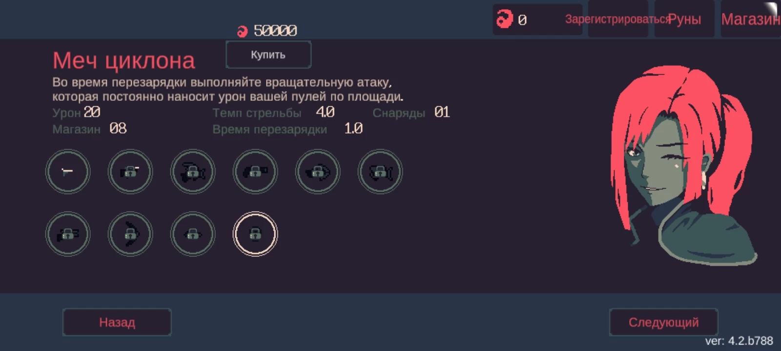Если грамотно использовать меч циклона, то он станет одним из самых сильных оружий в 20 Minutes Till Dawn. Именно поэтому к нему в пару мы возьмём Эбби — идеального персонажа для этой сборки из-за способности, которая удваивает её скорость выстрела с самого начала. Хорошо бы ещё взять способность, которая позволяет стрелять всеми оставшимися патронами в любом направлении.
