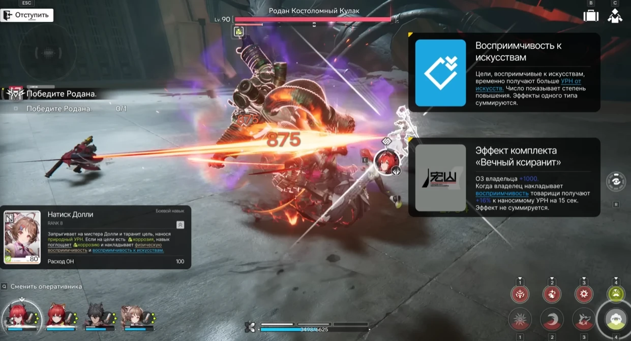 Следом за этим начинается QTE-ивент Арделии. Она накладывает на босса коррозию, после чего надо прожать её активный навык, чтобы поглотить коррозию и наложить «Восприимчивость к искусствам». Это даёт дополнительный урон и активирует бонус комплекта артефактов «Вечный ксиранит», дающий команде +16% к наносимому дамагу на 15 секунд.
