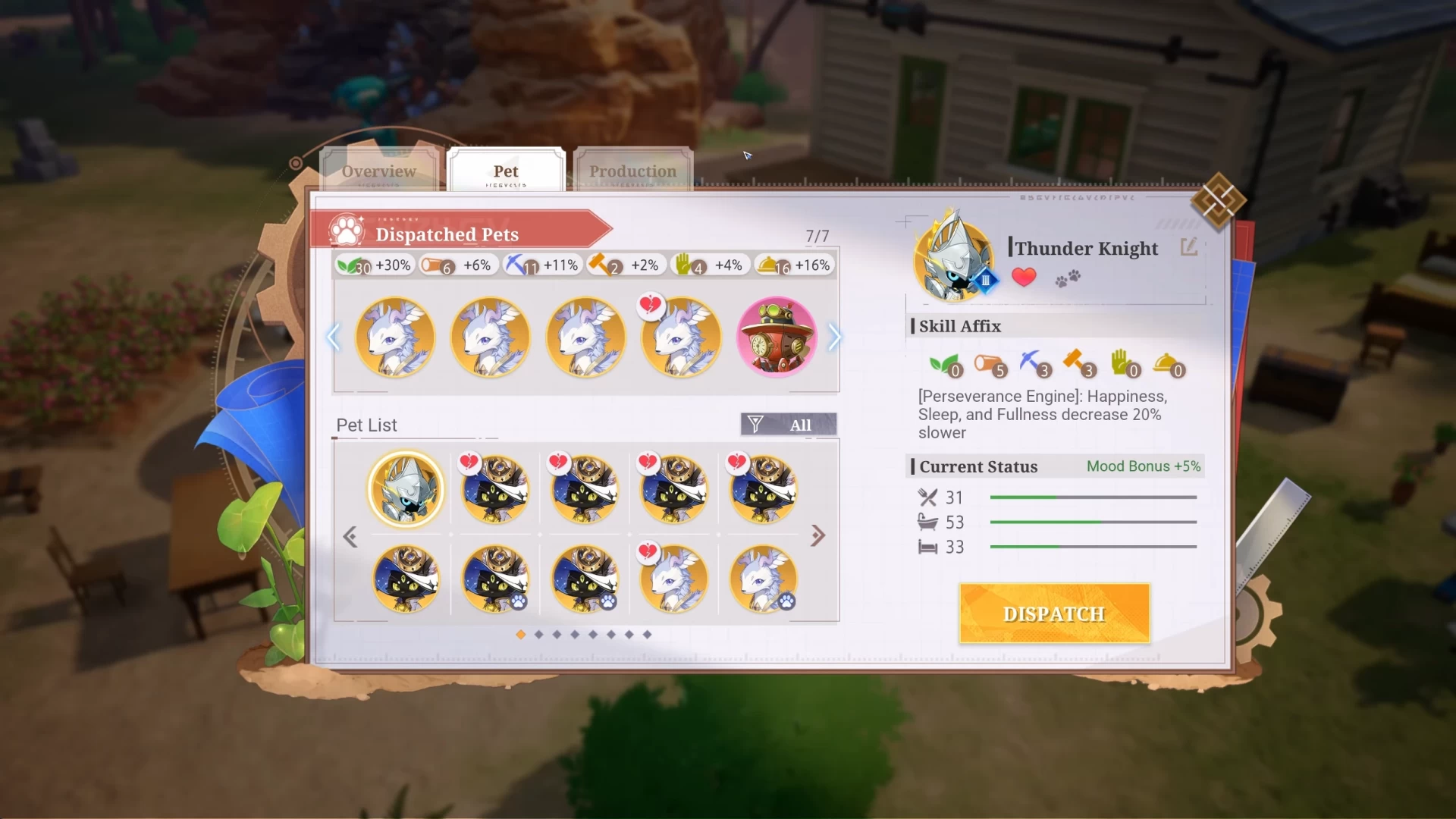 Вы можете использовать питомцев, привязанных ко всем вашим персонажам на аккаунте. Каждый пет имеет определённые навыки, что позволяет ему заниматься отдельными видами фарма на острове. Также у навыков есть уровни, что влияет на эффективность фарма. К сожалению, питомцы, которых вы получаете за прохождение сюжета, в основном имеют навыки 1-го уровня. Хорошая новость — уровни навыков всех питомцев, которых вы задействуете в работе, суммируются. Таким образом они работают сообща и дают друг другу бонусы.
