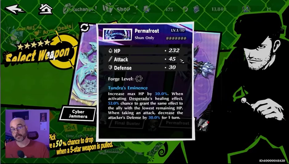 5-звёздочное именное оружие Permafrost увеличивает максимальное HP на 30%. Когда активируется лечащий эффект Desperado, есть 52% шанс дублировать этот эффект на союзнике с наименьшим HP. Если Шуна атакуют, защита атакующего уменьшается на 30% на 1 ход.