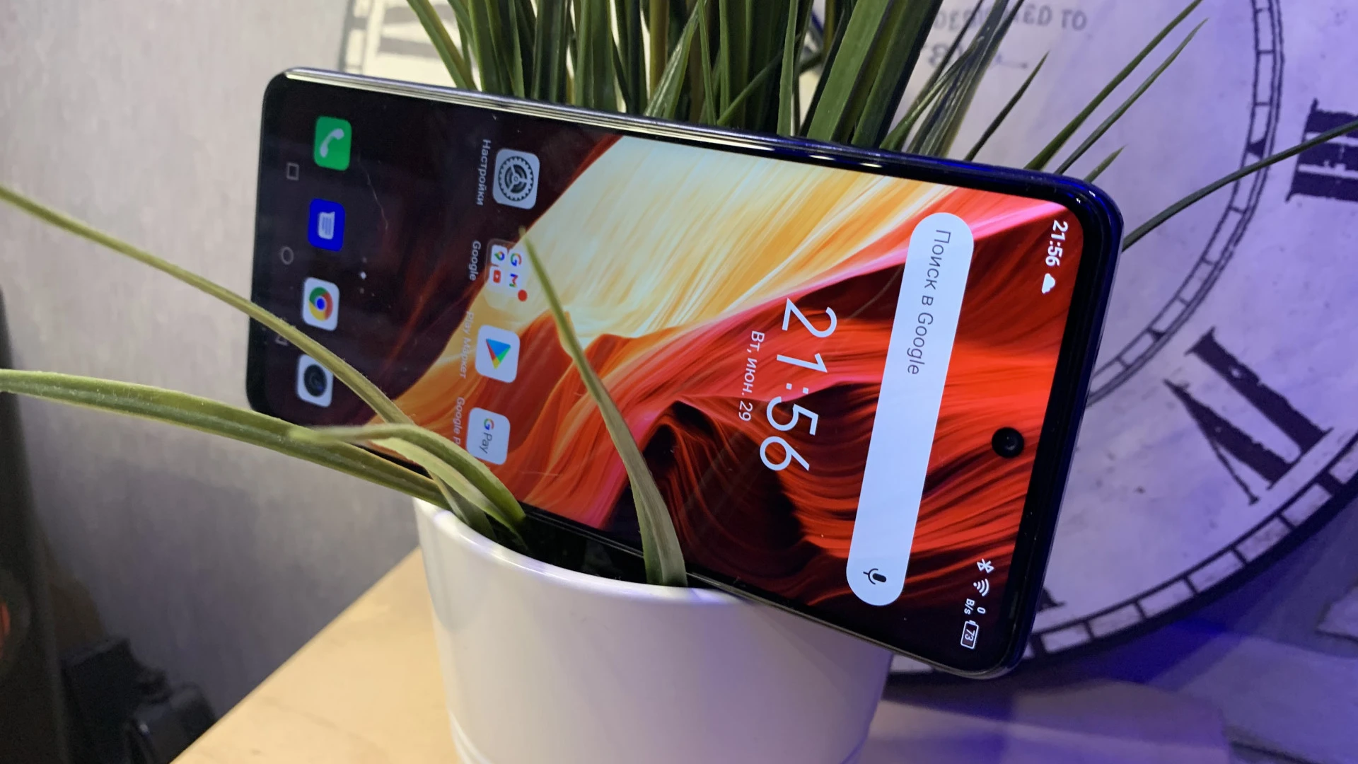 Сначала пройдёмся по технической части: у Infinix Note 10 Prо дисплей IPS LCD с частотой обновления 90 Гц. Диагональ составляет 6,95 дюймов, при этом соотношение экрана к корпусу — 84,8%. Из-за этого мы получаем настоящую «лопату» без выпирающих чёлок и рамок. Хорошо, если вы нечасто выходите с ней на улицу: 480 нит яркости хоть и вписываются в средние показатели по индустрии, этого недостаточно для комфортного просмотра контента под прямыми солнечными лучами. Ещё подобный экран не может выдать «настоящий чёрный».