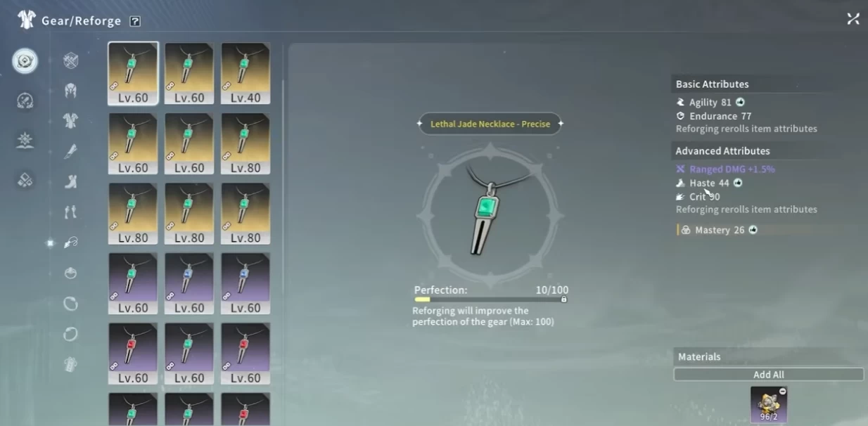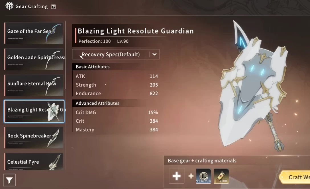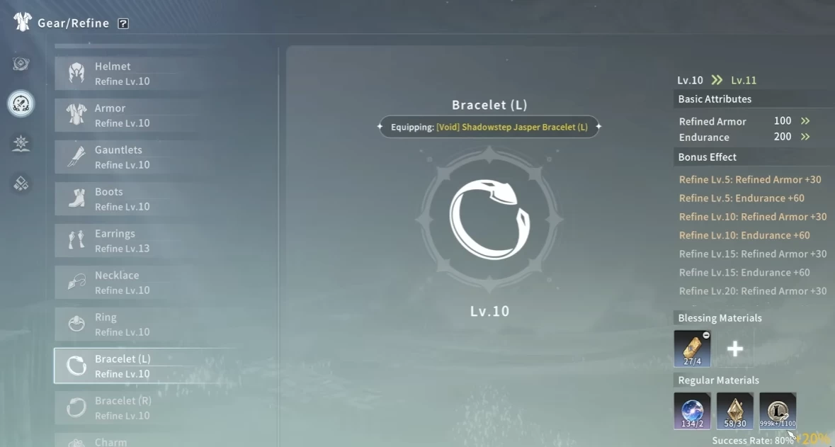 Последний момент, который мы обсудим — ещё один тип заточки всей экипировки. Вы начинаете с шансом успеха 100% и с каждой успешной заточкой увеличивается количество нужных ресурсов и понижается шанс успеха. В случае провальной попытки вам не возвращаются материалы, но шанс можно повысить с помощью особых предметов благословения.