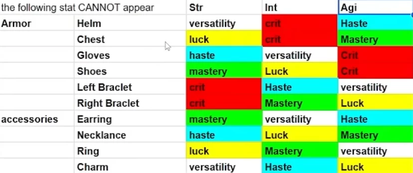 Ещё важно знать, что на отдельном типе экипировки никогда не может появиться стат, подкрашенный голубым цветом на скриншоте ниже. Вы можете фармить данжи сколько угодно, тратить на их прокачку все камни, но этот стат всё равно не появится.
