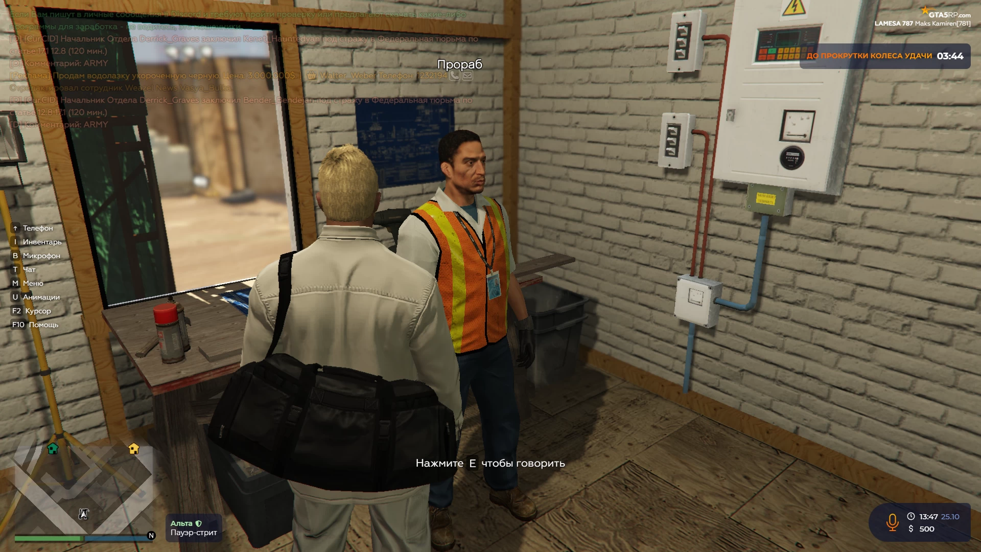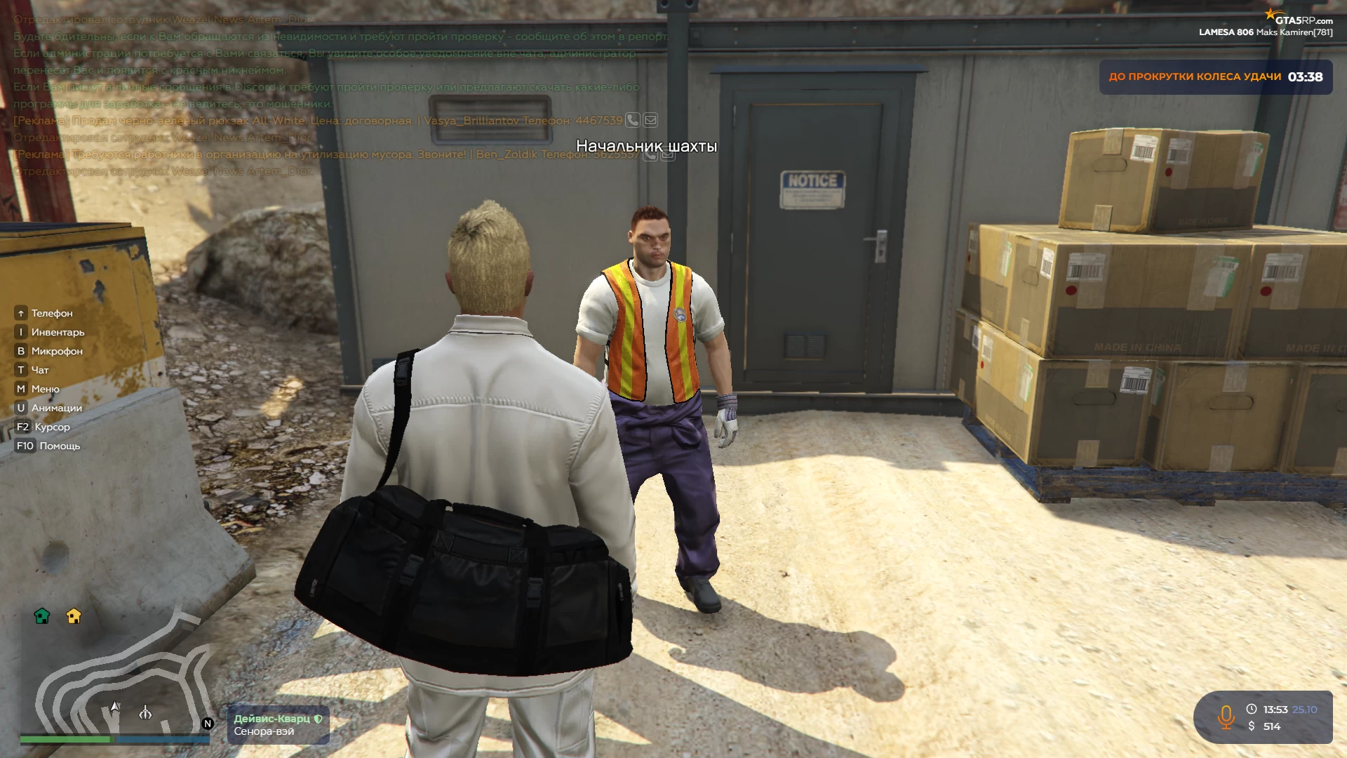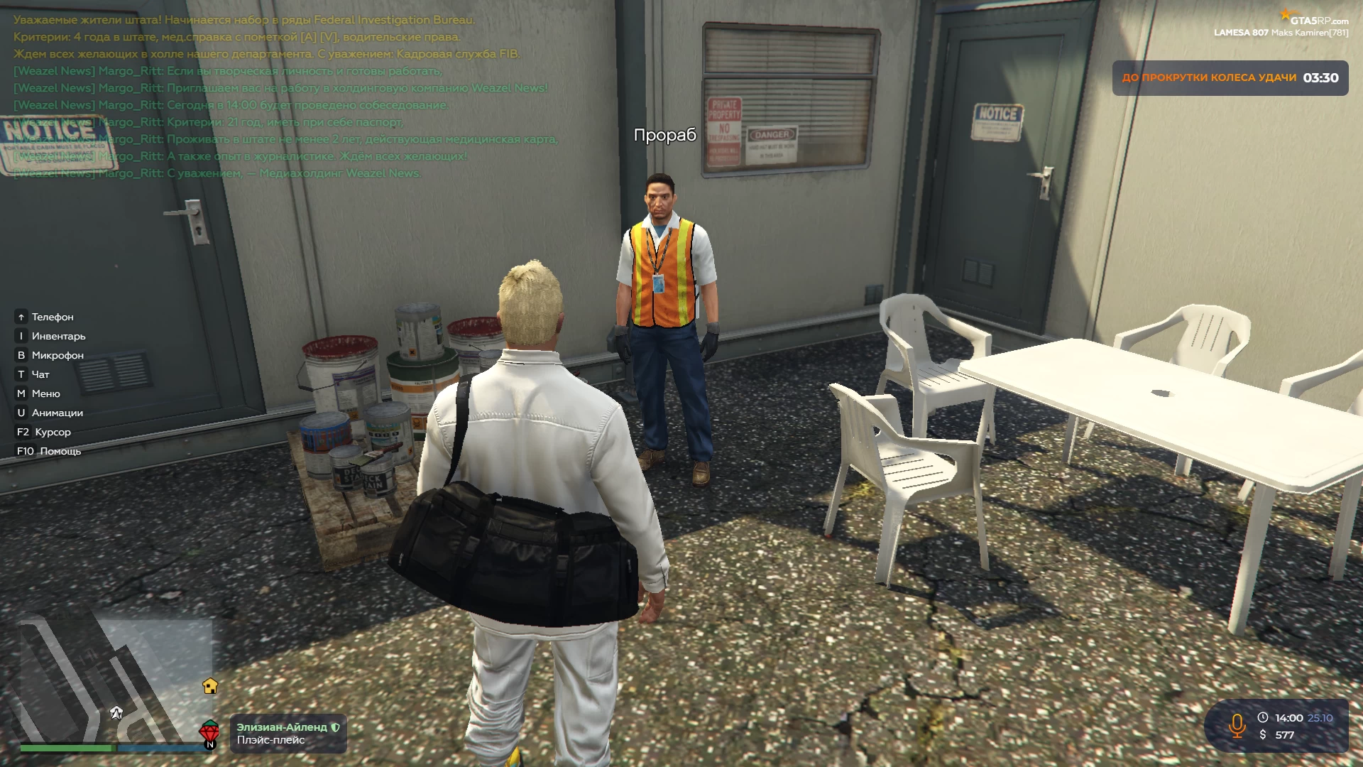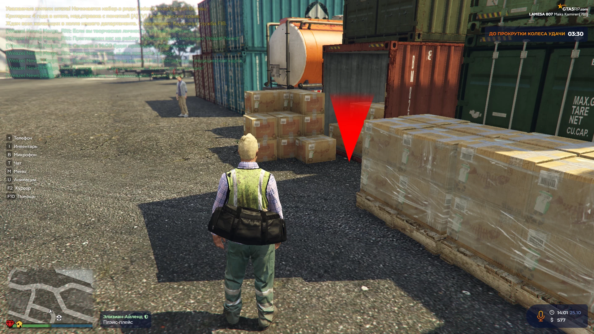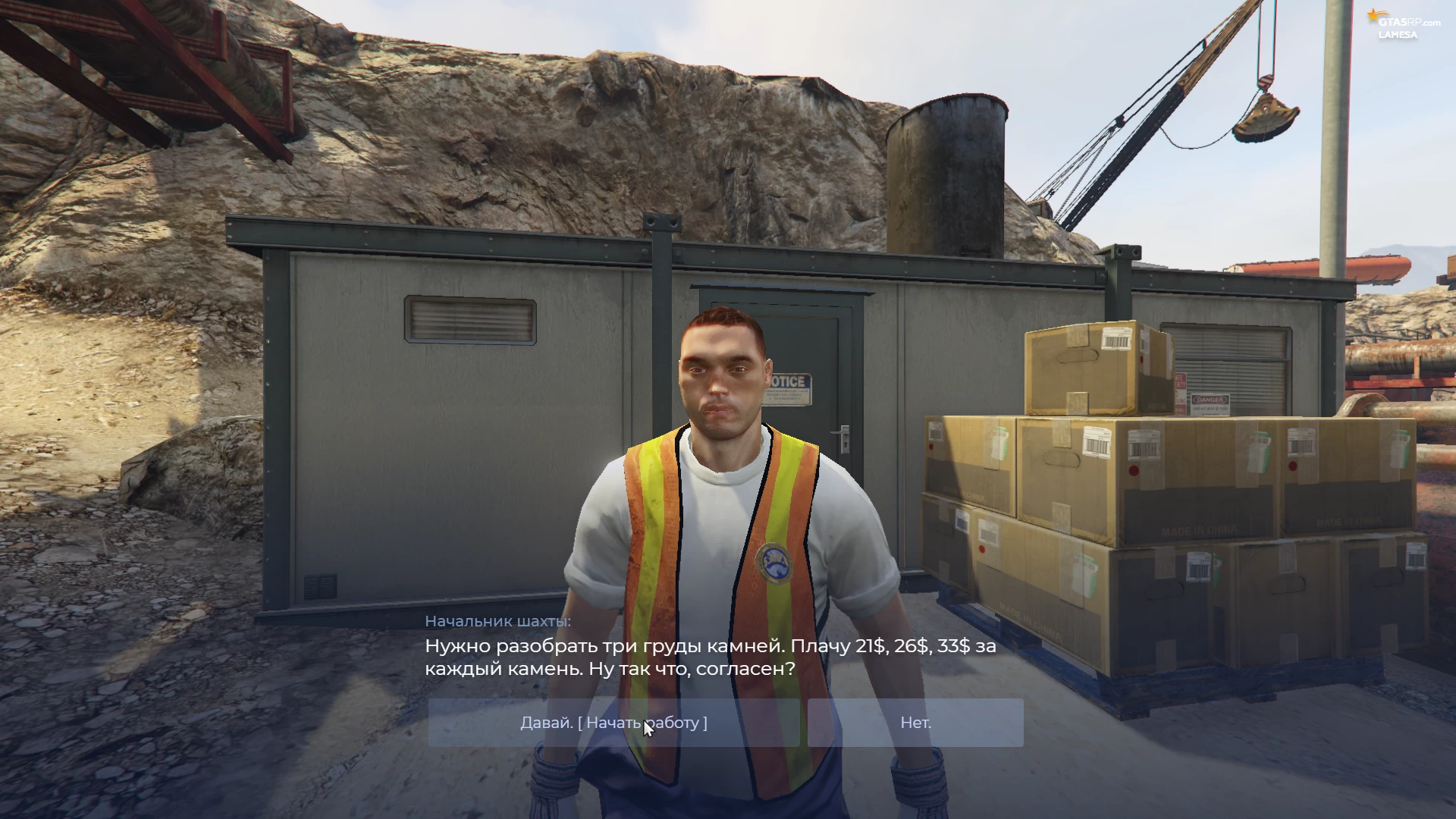 Как я уже сказали выше, на данном проекте есть три начальных работы: стройка, порт и шахта. Давайте вместе разберёмся, где они находятся и что вам необходимо будет сделать, чтобы получить свои первые деньги. По заданию Майкла вам необходимо будет выполнить 50 действий на одной из начальных работ.