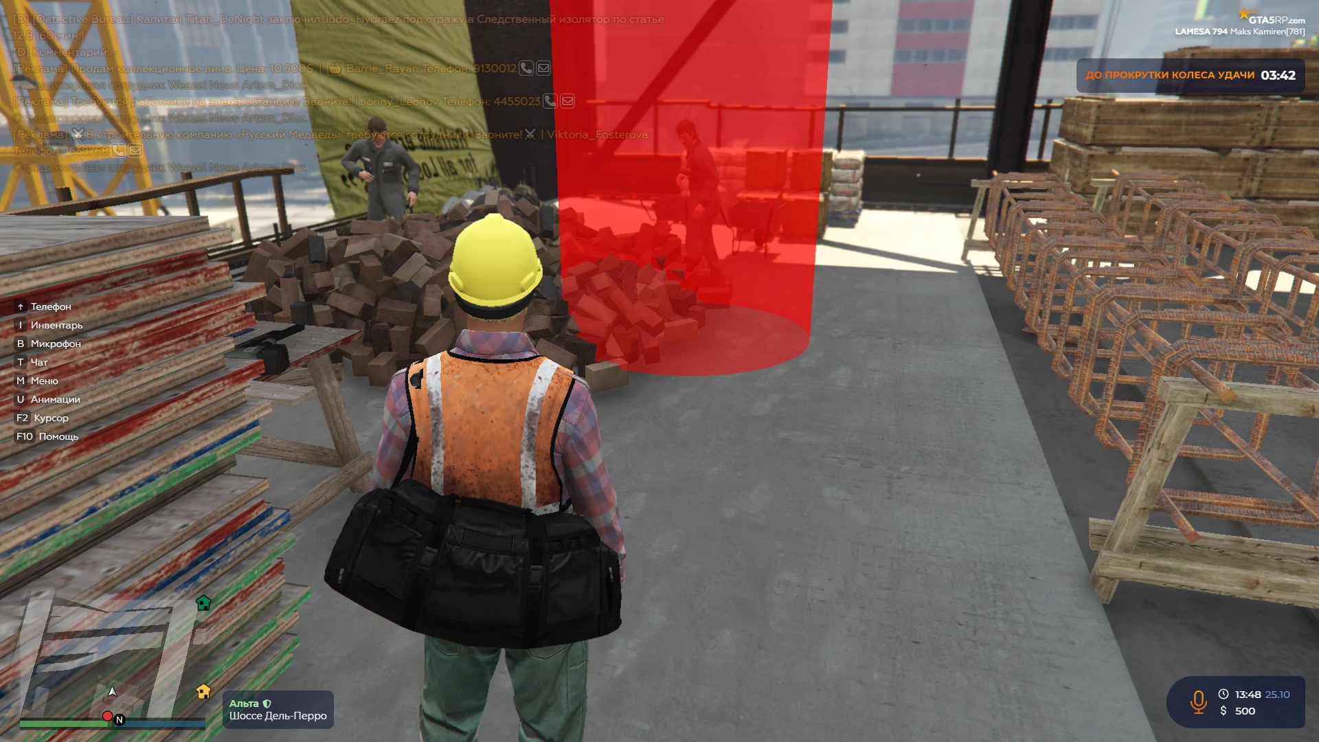 Поговорив с прорабом вы устраиваетесь на работу и вам автоматически выдают рабочую одежду. На мини-карте также появится красный круг, который указывает в какой области вам необходимо будет складывать кирпичи.
