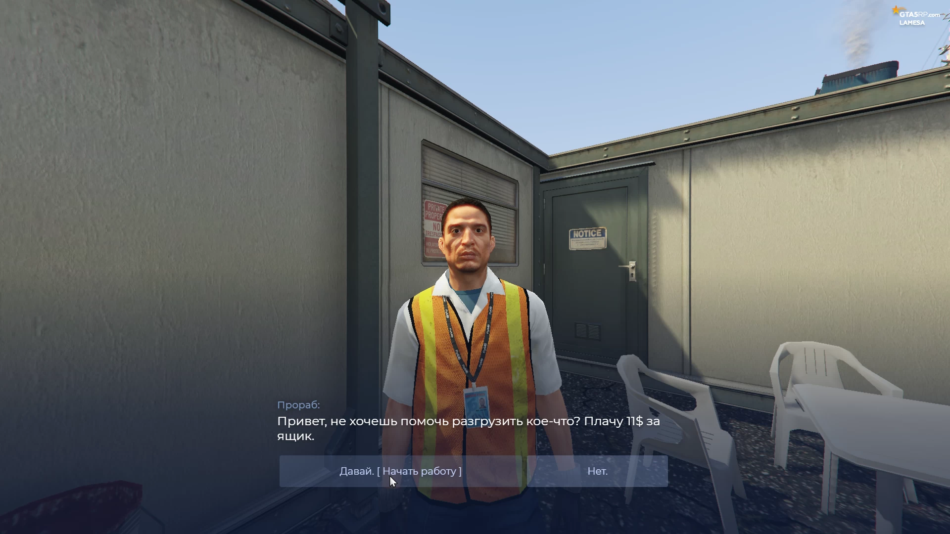 Мы приехали в указанное место и теперь нам необходимо найти прораба, который берёт вас на работу. Он находится в строительной будке, которую вы легко найдёте.