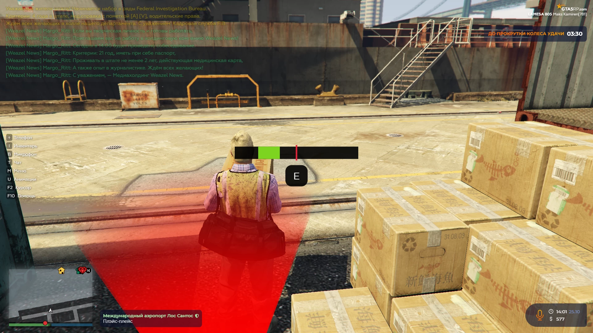 Подбежав на маркер, который находится у места сдачи, появится мини-игра, где необходимо вовремя нажать на Е, когда зеленый прямоугольник окажется посередине.