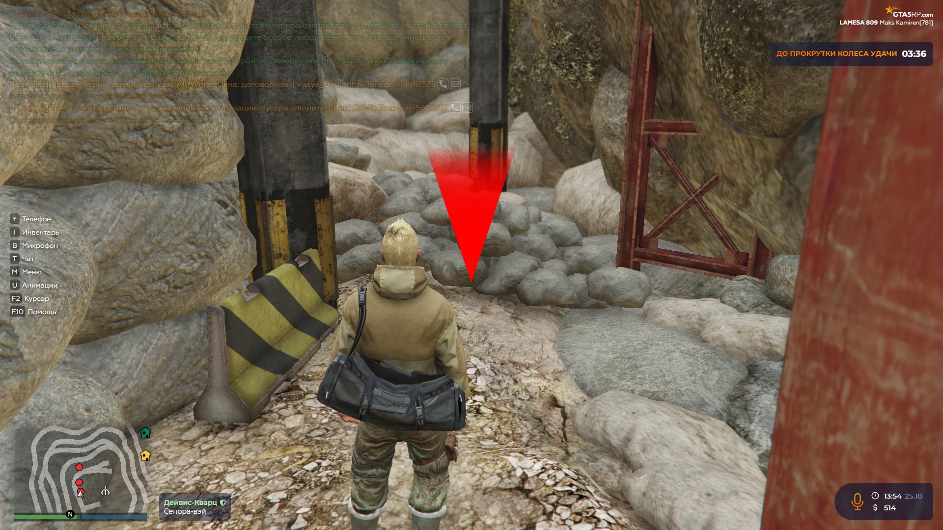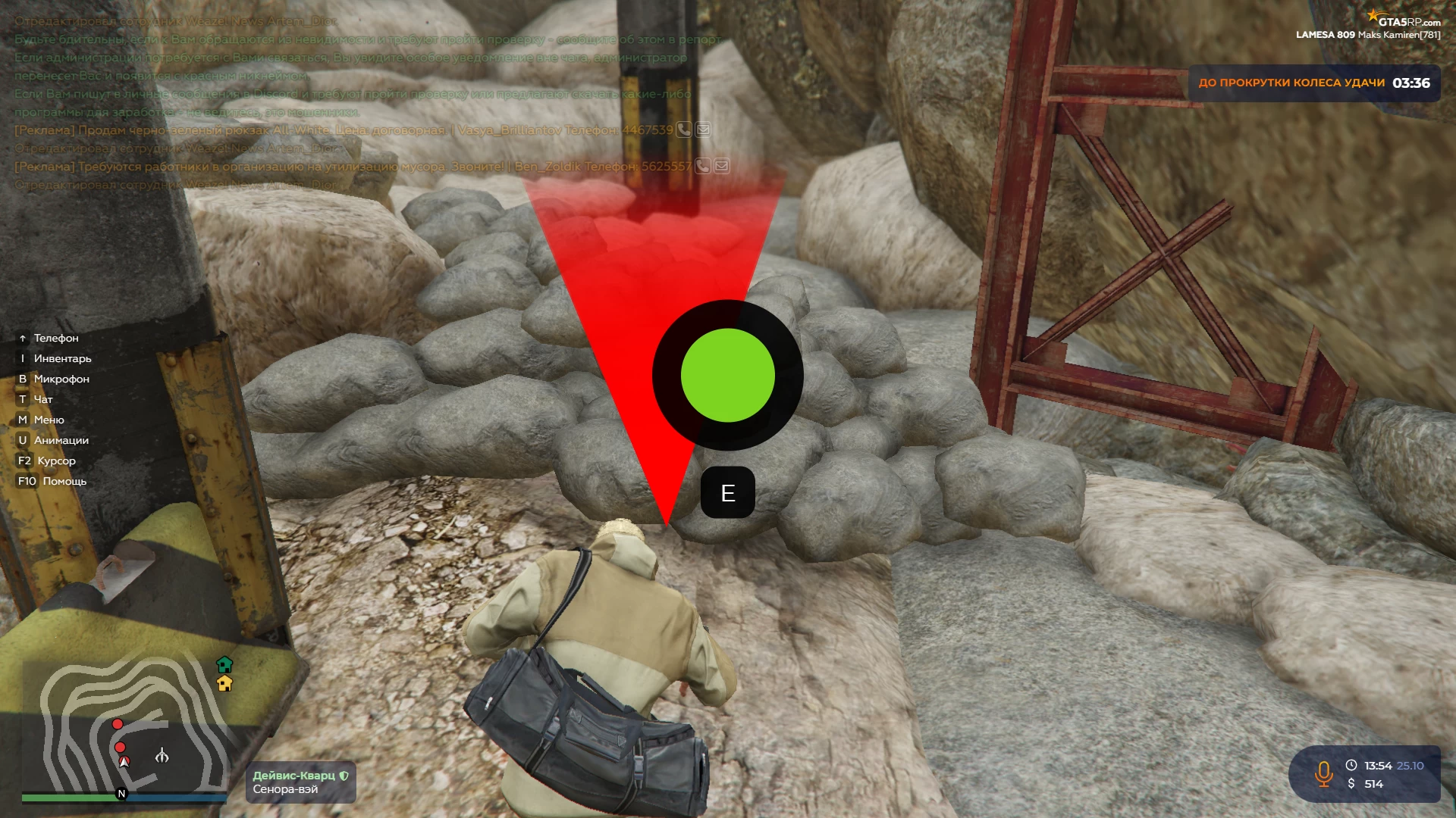 После того как взяли работу необходимо будет найти пещеру. Забегаете в шахту и увидите уже знакомый красный треугольный маркер. При приближении к маркеру появится мини-игра, нужно будет быстро нажимать на E. Как игра закончится, вы возьмёте в руки камень, который нужно будет вынести из шахты.