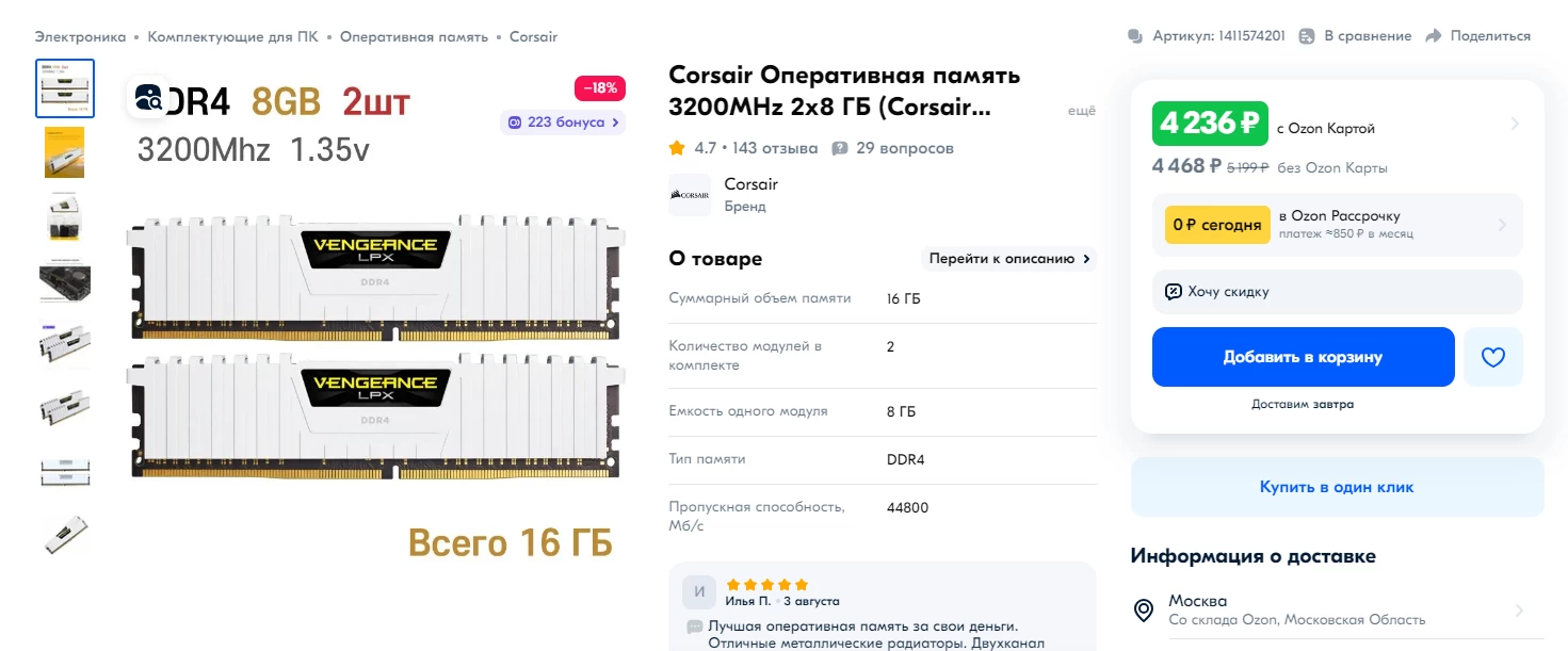 В PS5 Pro стоит 16 ГБ GDDR6. Для PC мы возьмём 16 ГБ DDR4 или DDR5. Как вариант — Corsair Vengeance 16 ГБ DDR4 3200 MHz. 2 плашки по 8 ГБ каждая стоят 4236 рублей на OZON.