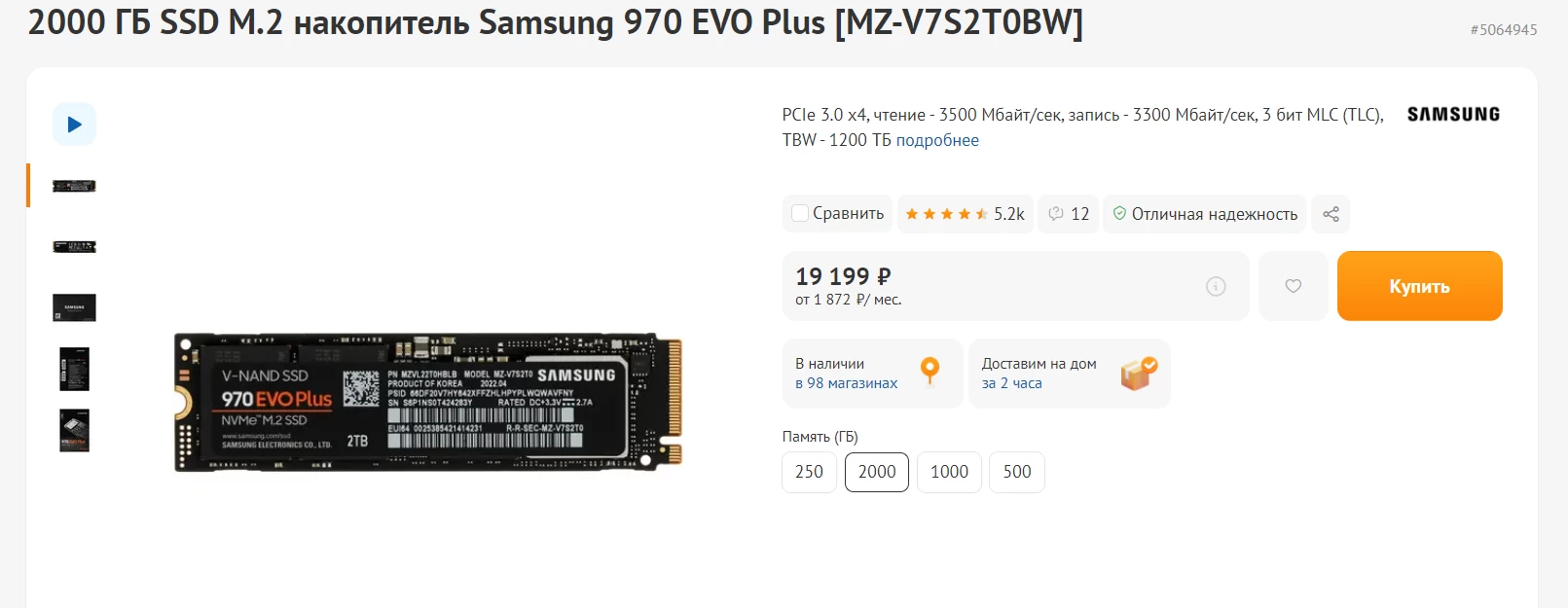 В PS5 Pro стоит 2 ТБ памяти. На PC присмотримся к Samsung 970 EVO Plus 2000 ГБ SSD M.2. В DNS он стоит 19 199 рублей.