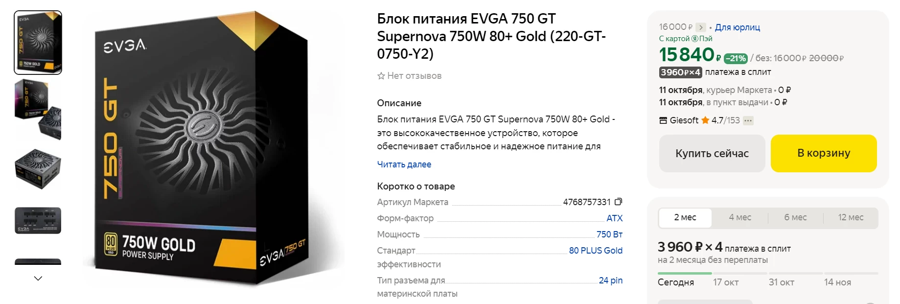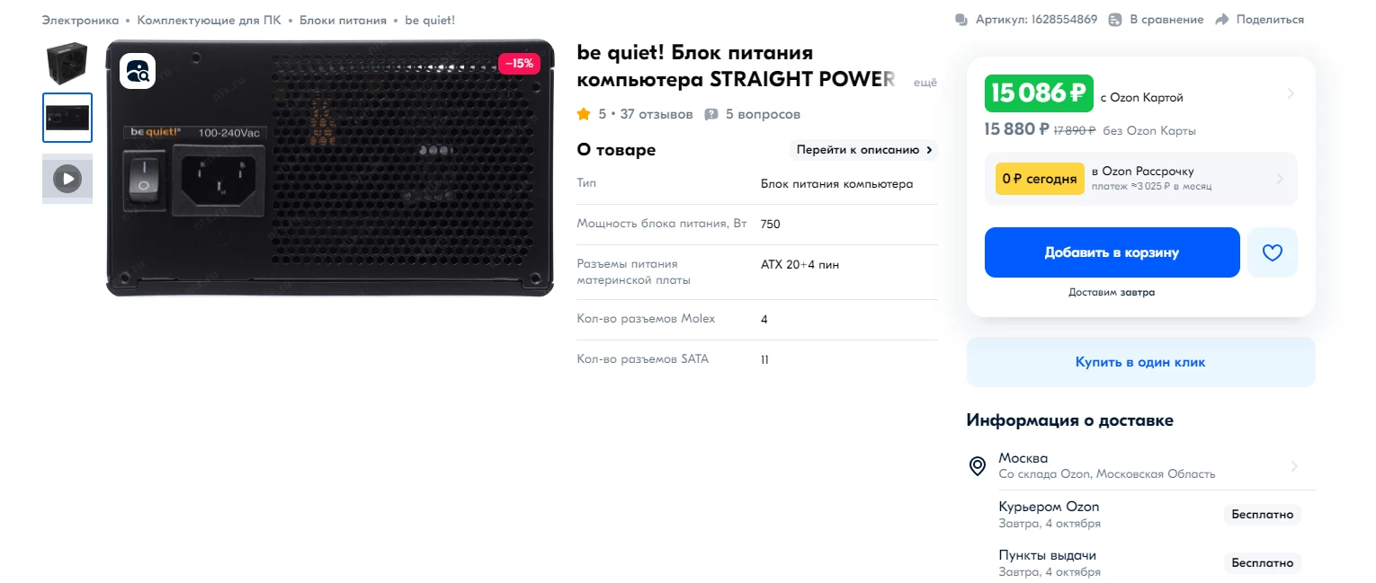 Блок питания возьмём мощностью 650-750 Вт и сертификатом 80 Plus Gold, 80 Plus Platinum или Titanium. Из качественных блоков можно взять Corsair RM750x за 20 403 рубля, EVGA 750 GT Supernova 750W за 15 840 рублей, Cooler Master V750 за 11 443 рубля или be quiet! Straight Power 11 750W за 15 086 рублей.