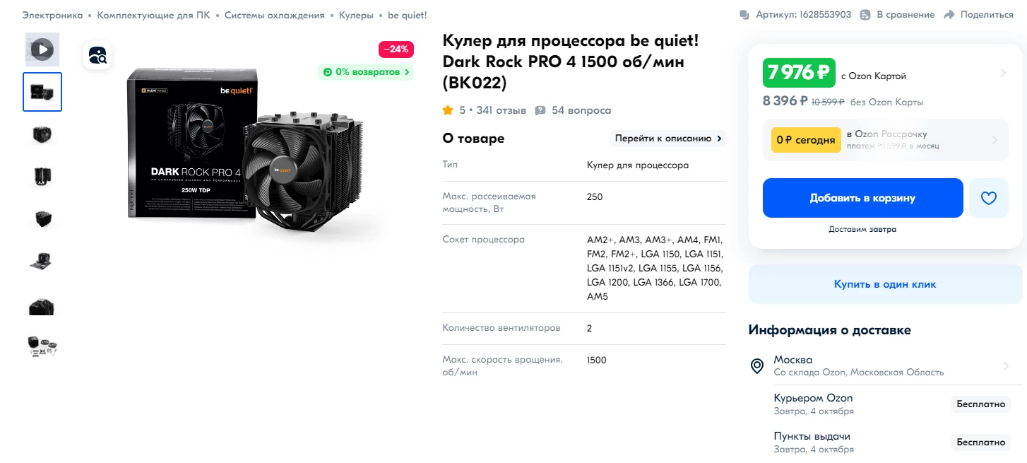 Под LGA 1200 (Intel) и AM4 (AMD) возьмём be quiet! Dark Rock PRO 4 за 7 976 рублей.