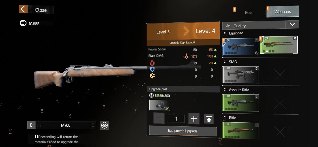 - Чтобы повысить уровень экипировки, выбираем предмет и нажимаем Upgrade. На это тратятся металлические материалы, а прирост уровня силы мизерный. Так что лучше искать более редкие пушки.