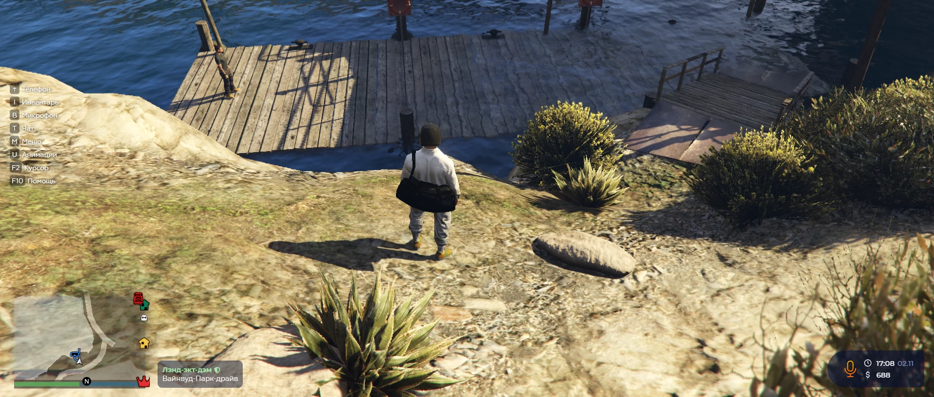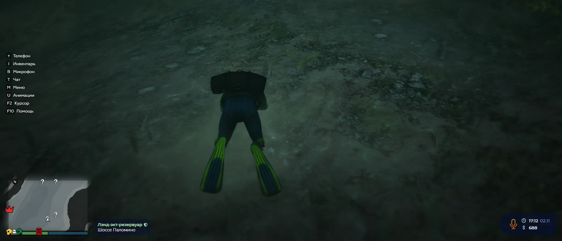 Прыгайте с пирса в воду и плывите на знаки вопроса, которые видите на мини-карте. Ими обозначен мусор, который вам необходимо собрать. После того как надоест работать, возвращайтесь к NPC и поговорите с ним.