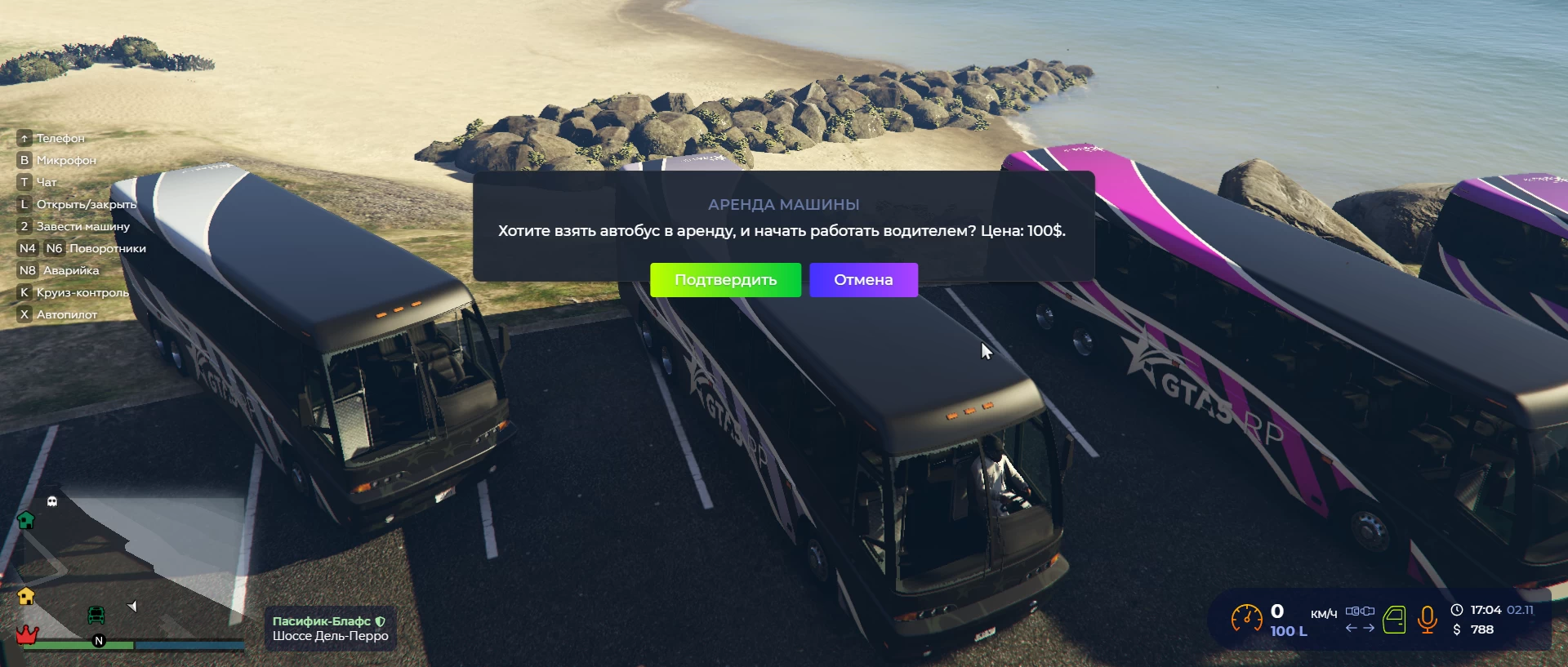 Прибыв на место вы увидите автобусы, которые можно арендовать. Для аренды сядьте в автобус и подтвердите ваше желание работать водителем. Сумму, которую должны будете заплатить, должна находиться у вас на руках, а не в банке.