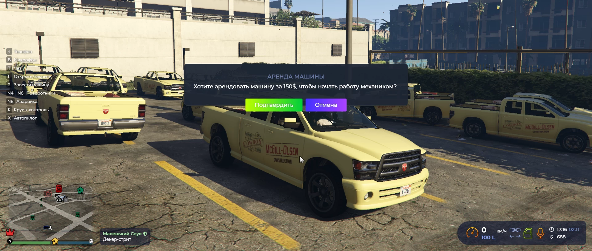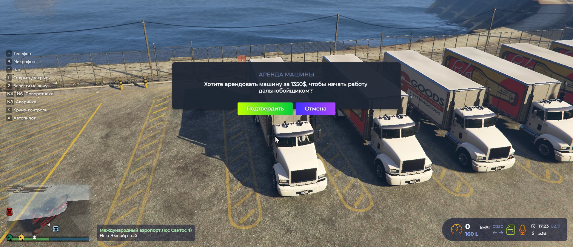 После того как сели в машину, появится окно, предлагающее арендовать грузовое т/с. Деньги на аренду должны находиться у вас на руках, а не в банке.