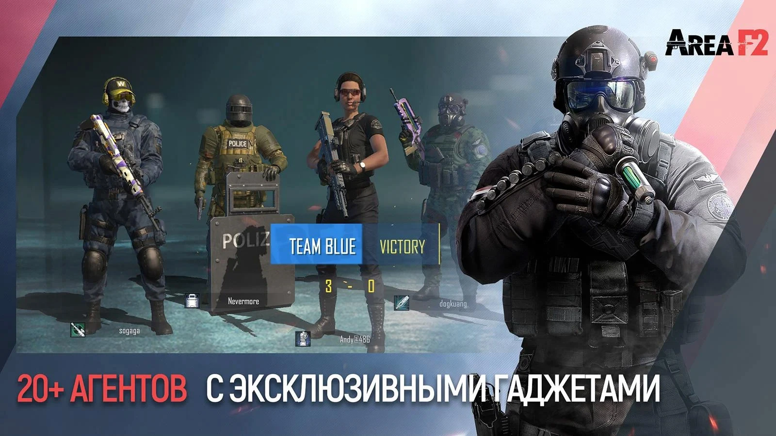 Area F2 — первый CQB (Close Quarters Battle) FPS для мобильных устройств. Игроки выбирают одного из агентов — каждый со своими особыми способностями — и атакуют или обороняются в невероятно реалистичном окружении. Любую крышу или стену можно укрепить или, наоборот, разрушить. Игра заставляет бойцов проявлять недюжинное мастерство и тактическую смекалку — ведь враг может прорваться через любую стену.