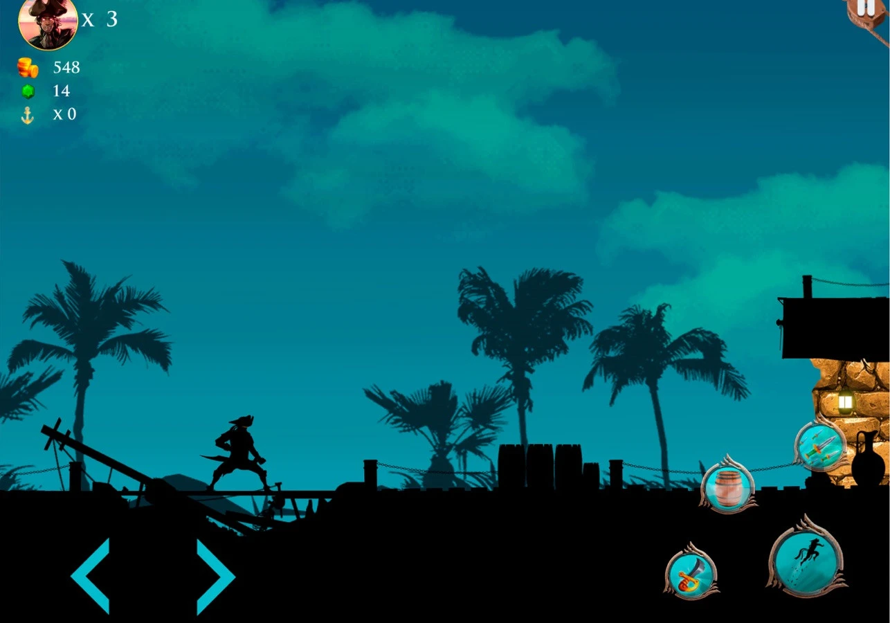 Замысел такой: мы прыгаем по локациям с пиратскими парусными кораблями на заднем фоне. Наш герой — пират. Он высоко прыгает и кидает ножи в противников. Сюжет простой: наш корабль украл какой-то бородатый пират с открытым черепом, нам нужно вернуть украденное. Управление аркадное, графика подлагивает на iPhone 8.