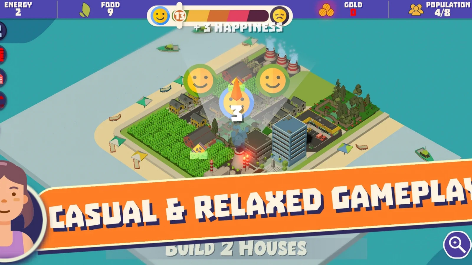 Её главная механика завязана на градостроительной стратегии. Игра разбита на уровни, в каждом можно получить максимум четыре звезды. Графика минималистичная, во время прохождения надо следить за четырьмя ресурсами: энергия, еда, золото и население. Первоначальные задачи простые: постройте дом, фермы и так далее. Каких-то таймеров или энергичной музыки нет, поэтому игра идеально подойдёт для расслабления вечером.