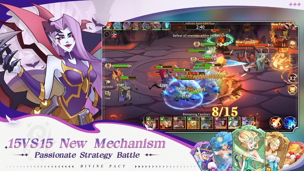 В Divine Pact нужно будет собирать команду из 15 героев, чтобы участвовать в схватках формата «стенка на стенку». Бои будут проходить в реальном времени, а для победы предстоит выстраивать синергию между разными классами, расами и стихиями. Стоит ожидать, что сражения будут автоматическими, но разработчики всё же упоминают слово «микроменеджмент» при описании боёв.