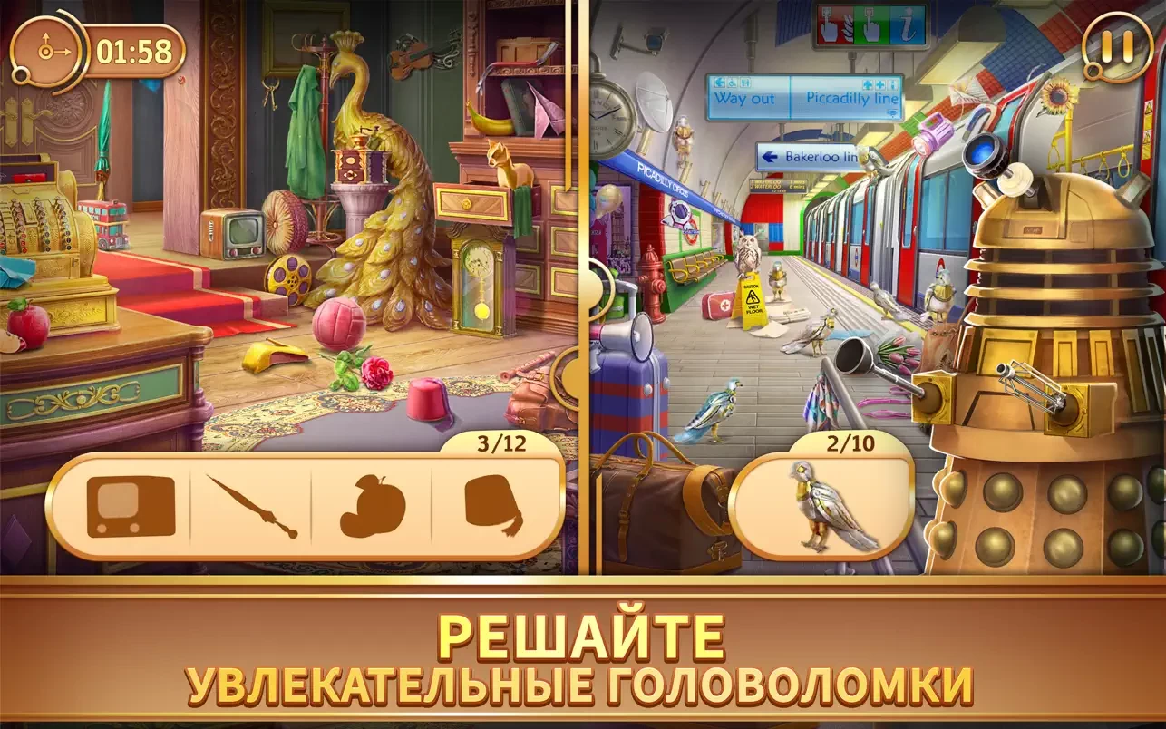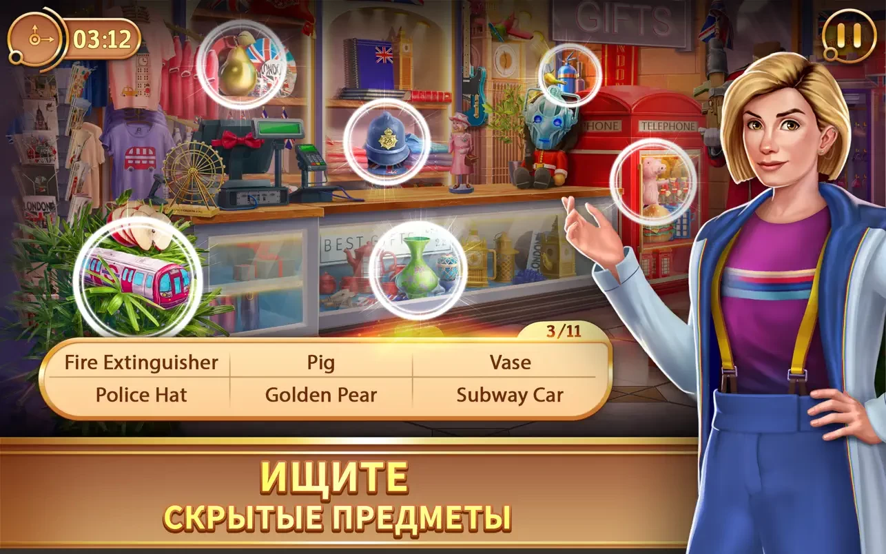 Doctor Who: An Unlikely Heist — мобильная игра. Судя по геймплею, это проект для тех, кто любит разгадывать головоломки, искать предметы и помогать любимым героям сериала «Доктор Кто». Игроки будут искать скрытые предметы на локациях, только вот их названия на английском. А чтобы игроки не заскучали, разработчики добавили тикающий таймер в каждый уровень.