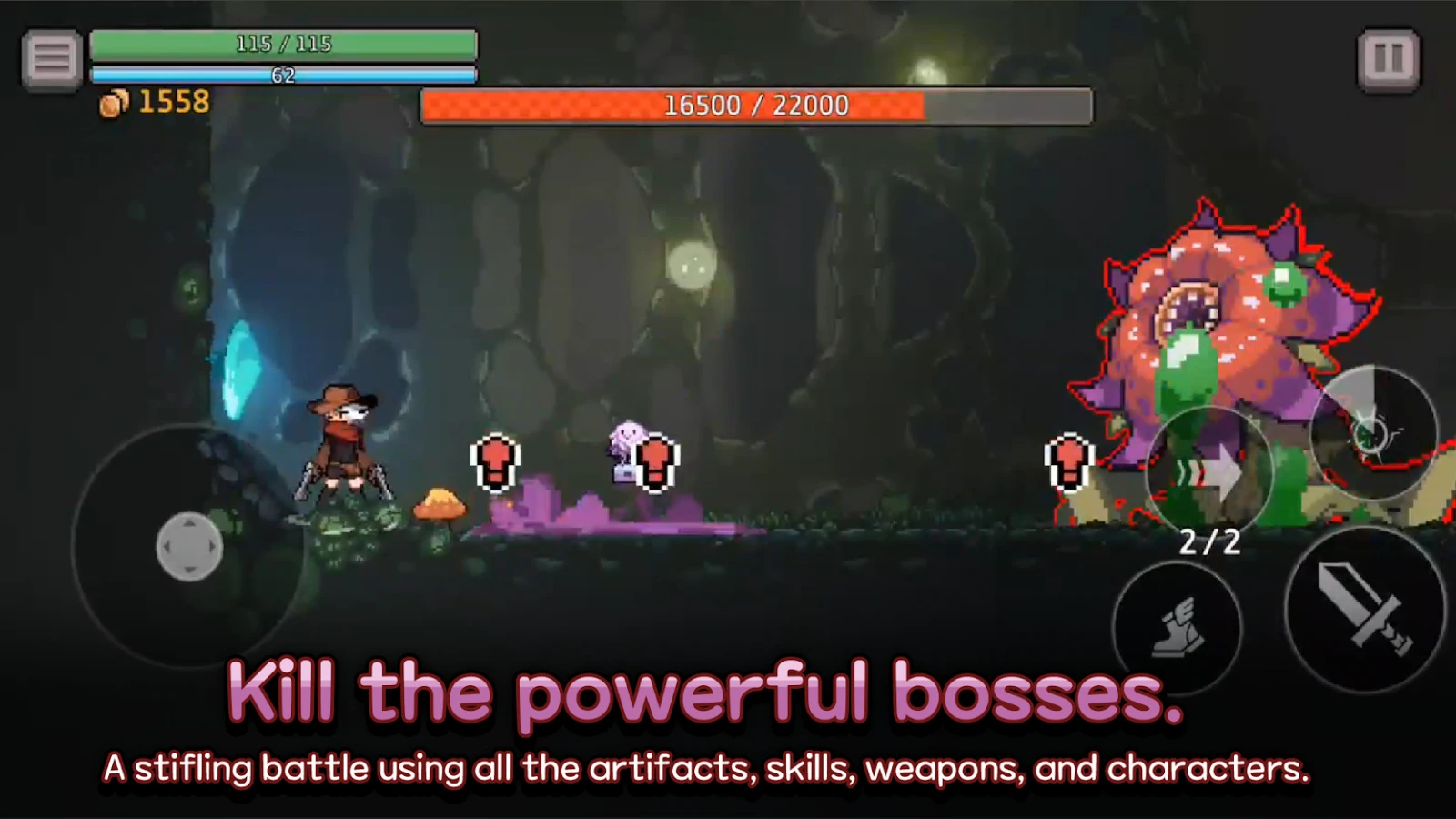 Dungeon Slasher: Roguelike — мобильная игра. В ней английская локализация и геймплей, разбитый на уровни. Мы должны уворачиваться от атак врагов, подпрыгивать и уничтожать их ради получения опыта, золота и новой экипировки. Так как это рогалик с щепоткой метроидвании, вам постоянно придётся парировать вражеские атаки и следить, чтобы при прыжке на платформу не упасть на торчащие из земли копья.