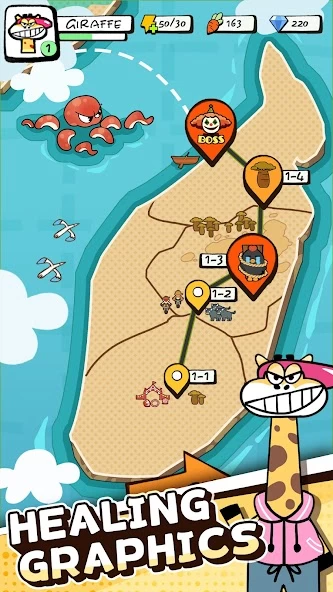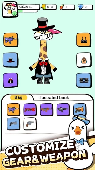 В Giraffe Quest вертикальный геймплей, персонаж — храбрый жираф — бежит и стреляет сам, поэтому остаётся только двигать им для уклонения от врагов. В конце уровня будет ждать босс со специальными умениями: использование охотничьих ловушек и так далее. За победы выдают золото.