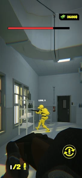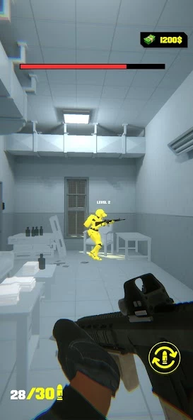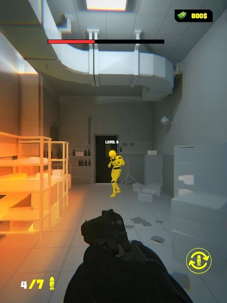 Ваша главная цель это добраться до белой дверки. Сделать это можно, если уничтожить всех врагов-ботов на вашем пути. Их может быть от 1 до 5 на уровне, в зависимости от вашего ранга, который потихоньку повышается с каждой победой. Помимо этого вы зарабатываете деньги, которые можно потратить на прокачку своей штурмовой винтовки или на покупку другого оружия: например, дробовика.