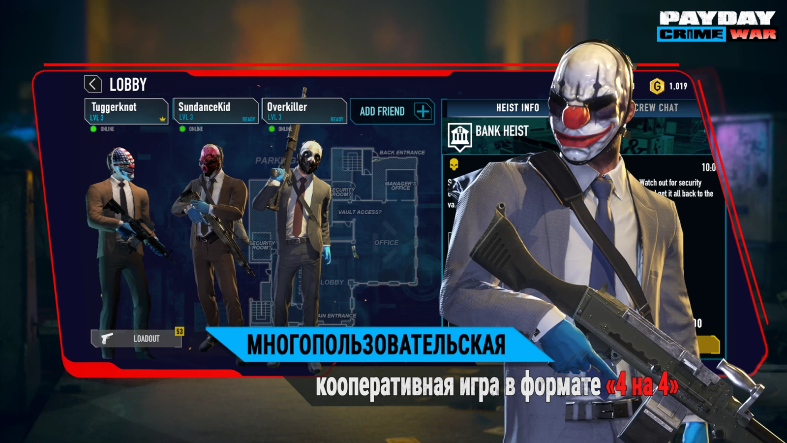 На этой странице собрана вся доступная нам информация о Payday: Crime War. Выход игры IOS, Android состоялся 6 июня 2023. Игру можно отнести к таким жанрам как: шутеры, экшены, игры с мультиплеером, тактические игры, современный сеттинг. Также на этой странице вы найдете описание Payday: Crime War, даты выхода на все платформы, её трейлеры, отзывы пользователей, последние новости, статьи и обзоры, оценки посетителей и редакции.