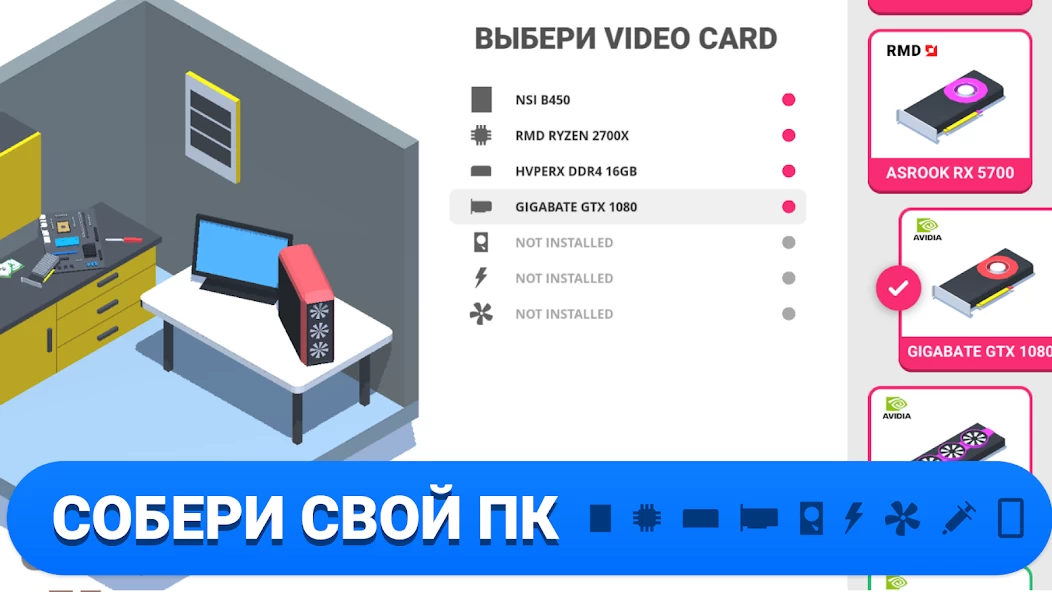 PC Creator это игра симулятор ПК, в который вы выступаете в роли сборщика ПК. Это бизнес игра и тут нужно исполнять заказы клиентов по различным требованиям: собрать компьютер с нуля, монтировать образы операционных систем, обновлять компьютер, устанавливать различные программы, игры и многое другое.