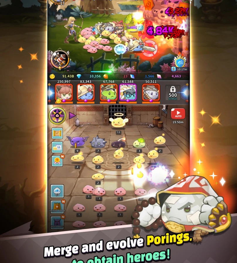 Игровой процесс вертикальный, экран разбит на две части (привет, Nintendo 3DS). Вверху наш герой сражается с милыми слизнями, а внизу мы должны этих ребят скрещивать. Большой акцент делается как раз на второй аспект. В итоге слизни прокачиваются, меняются в цвете. В общем, что-то из Покемонов. Музыка приятная, графика тоже. При этом есть мнение, что в итоге всё сводится к трате своего времени и донату.