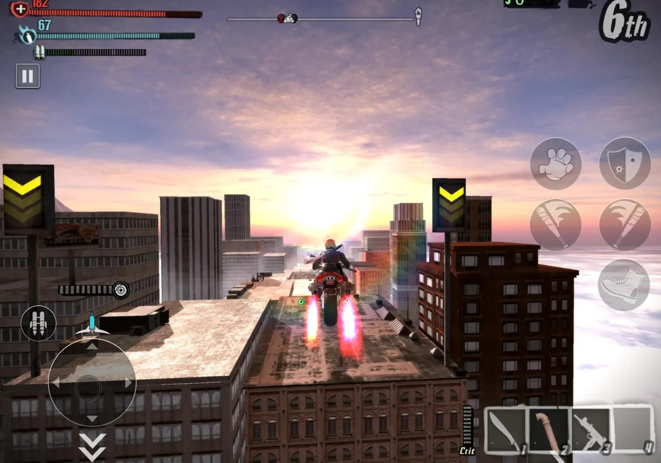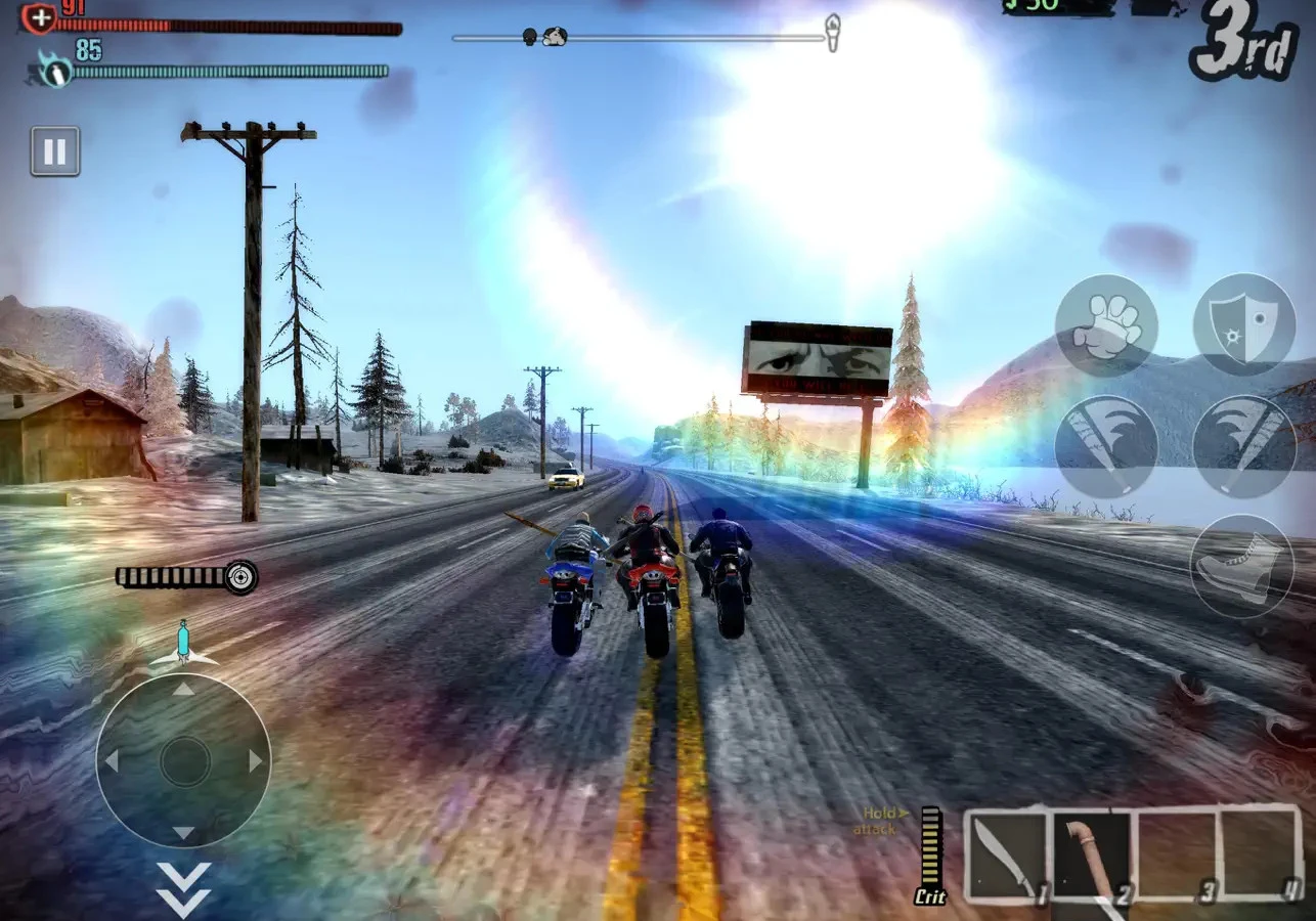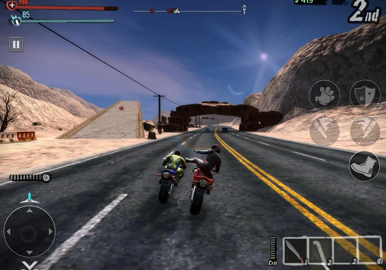 Road Redemption Mobile предлагает гонки на мотоциклах, где главная цель не только прийти первым на финиш, но и подраться с соперниками при помощи разного холодного оружия. Вам предстоит возглавить банду мотоциклистов и покататься по США, зарабатывая деньги и проходя гонки. Постепенно можно улучшать персонажа, мотоцикл и оружие.