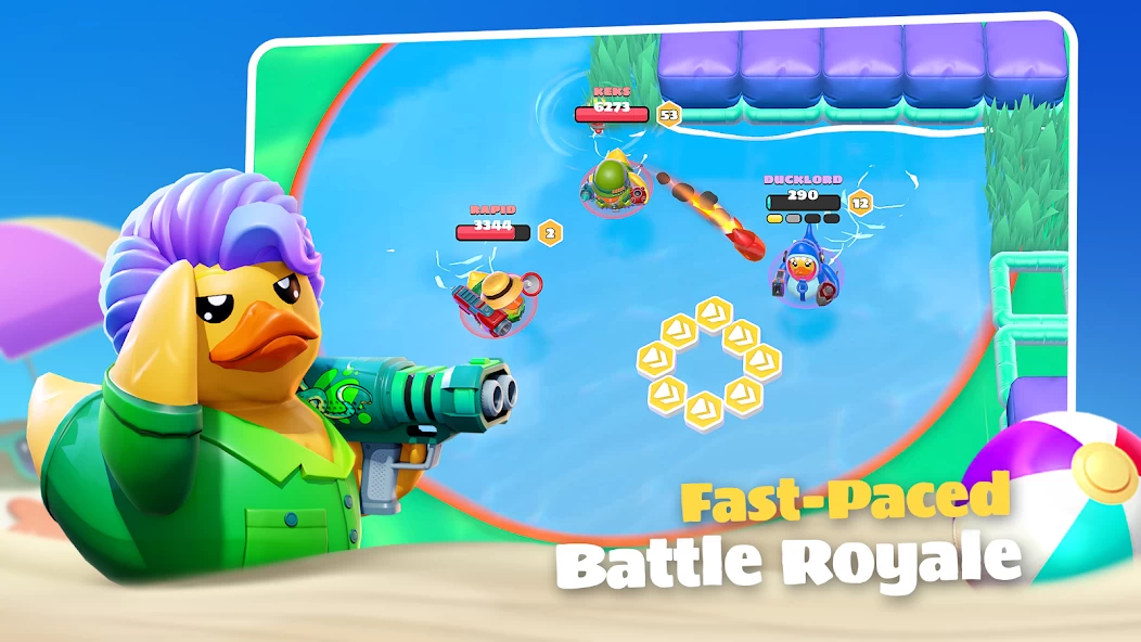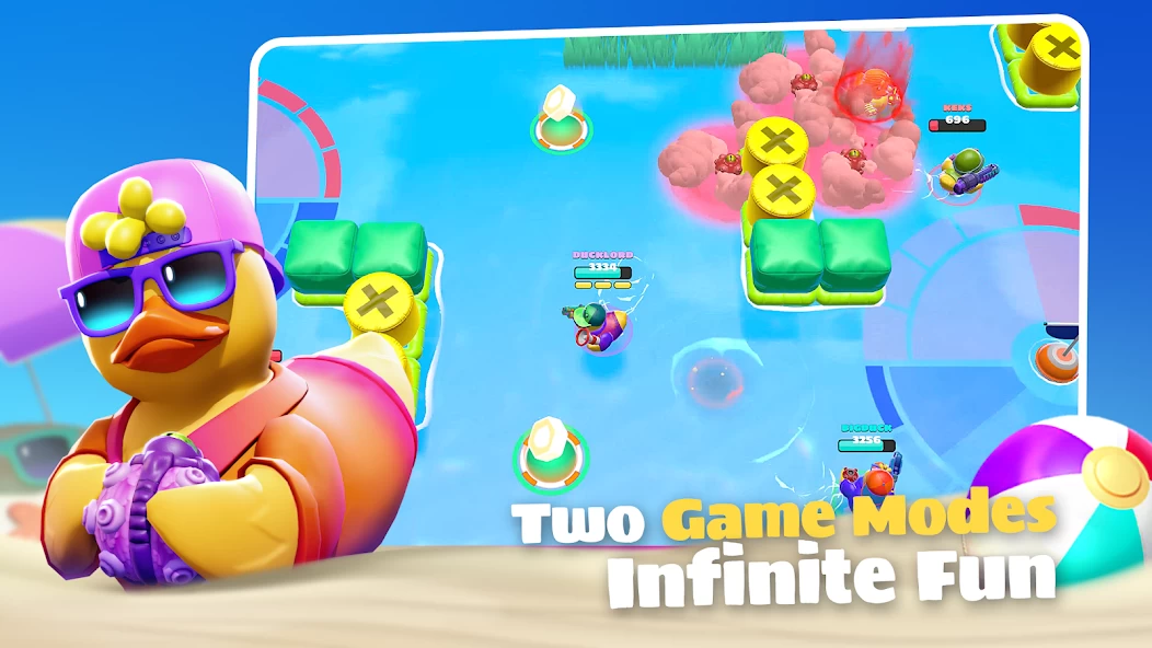 The Ducks это необычная игра про резиновых уток с разными модными скинами, которые выясняют отношения на морских локациях в формате Brawl Stars. Местные сражения проходят в жанре «королевская битва», где вы собираете монеты, прячетесь за укрытиями, выставляете мины и стараетесь остаться внутри безопасной зоны.
