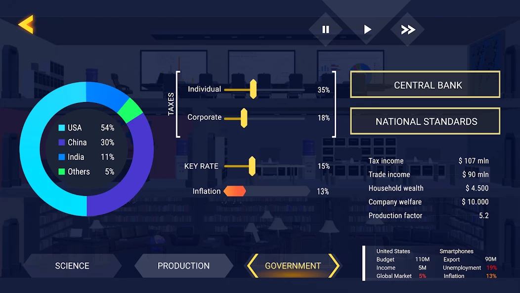 Trade Wars — игра про войну, но вместо танков, мин и беспилотников в ней используются понятия «торговая война» и «мягкая сила». По сути это получение влияния без использования грубой силы. Игра доступна на iOS и Андроид и распространяется бесплатно; за деньги вы можете открыть сразу все страны и индустрии. Без этого придётся начинать играть за США и пытаться задавить другие государства электромобилями; такое могло только присниться Илону Маску.