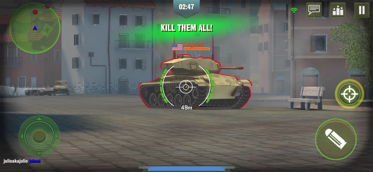 Битвы от третьего лица, наведение, выстрел и так далее. Проект довольно минималистичный в плане графики и интерфейса. Выстрелы танков очень аркадные. На поле боя могут спокойно парить в воздухе патроны, звёздочки, аптечки, монетки и так далее. В общем, привет 2000-е. Первый режим — тоже детматч с мгновенным воскрешением после смерти. После серии убийств появляется надпись на пол экрана, но закадрового голоса нет. В конце матча нам показывают, сколько заработано монет и других очков.
