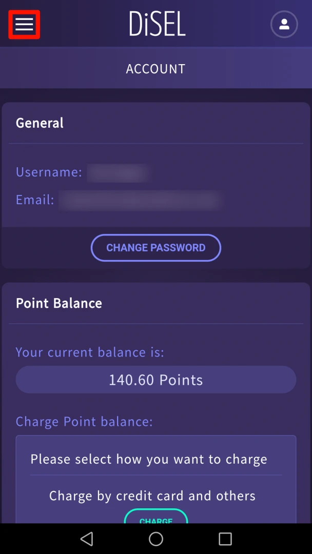 - 2. В открывшемся окне ACCOUNT, нажмите иконку меню в левом верхнем углу экрана.