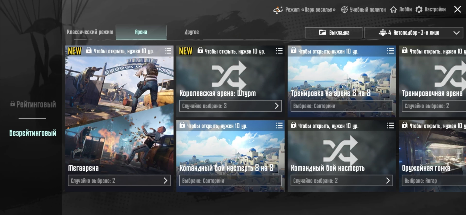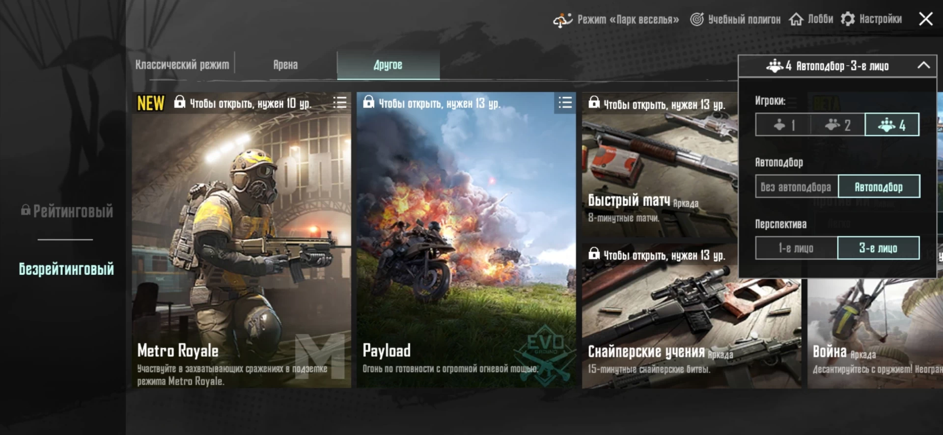 Здесь PUBG Mobile показывает себя во всей красе, ведь в ней существует огромное количество интересных режимов, которые подойдут любым игрокам. Они постепенно открываются по мере повышения уровня персонажа — классический режим доступен с самого начала, рейтинговый режим доступен с 8 уровня, арена и «Metro Royale» открываются с 10 уровня, а быстрый матч, «Payload», снайперские учения и война открываются на 13-ом.