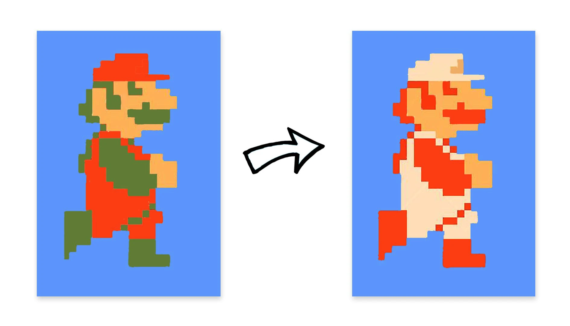 Вот, например, Марио из классической Super Mario Bros 1995 года. Изображения героя идентичны по форме, но отличаются цветом.