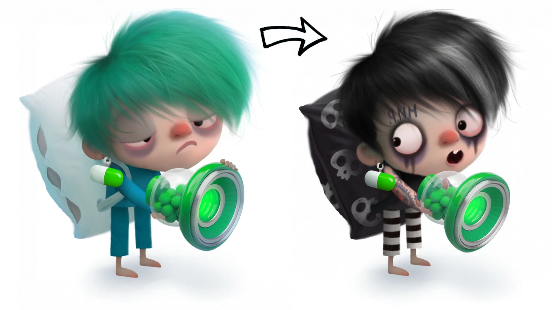 На картинке ниже Слипи. В базовом виде — это страдающий от бессонницы парень. В рескине — фанат эстетики Тима Бёртона и готических страшилок. Важно, что мы не повторяем изначальную тему персонажа (сонливость), но находим новую, которая с ней рифмуется и не противоречит.