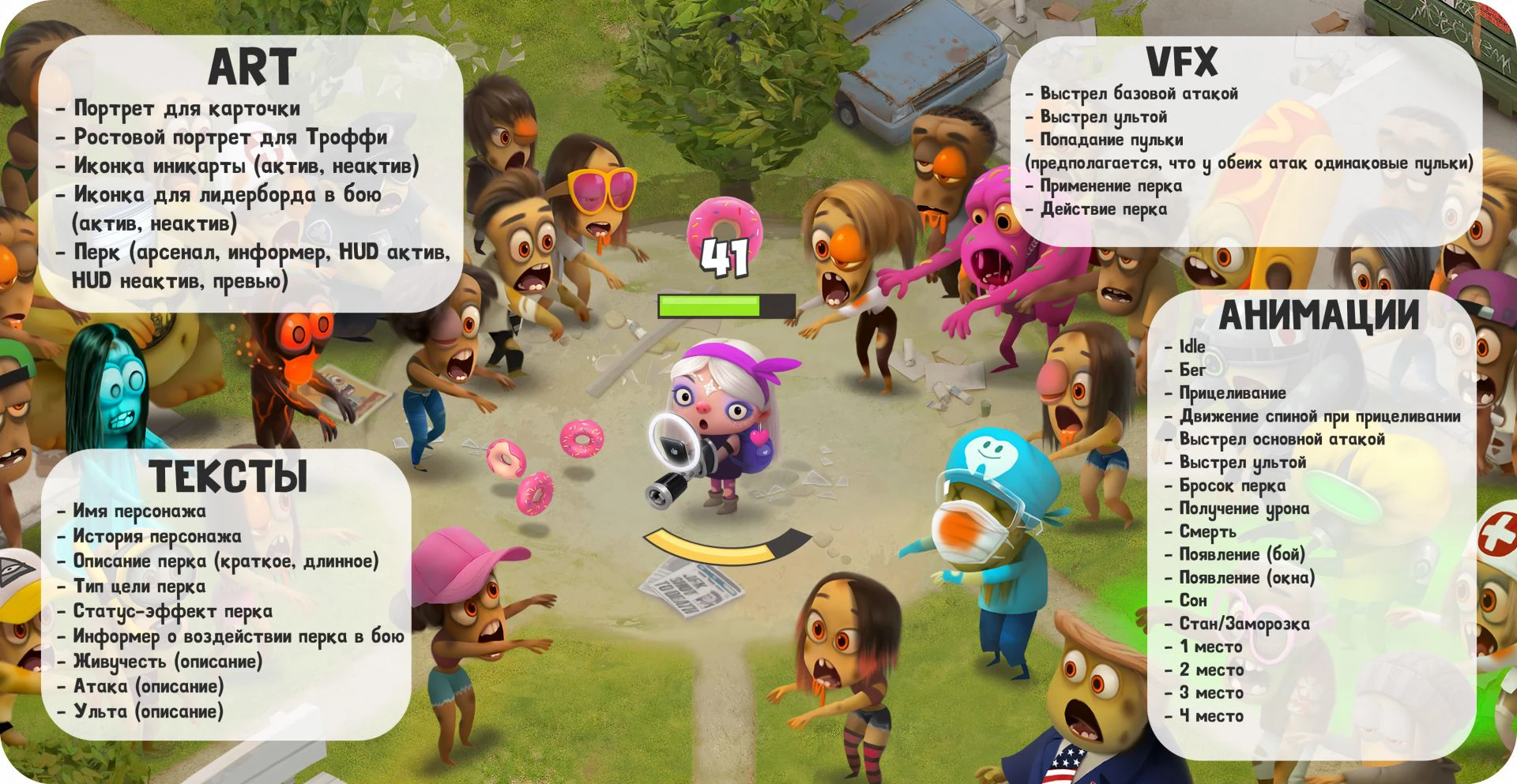Мы уже знаем, что персонаж в игре начинается с геймдизайна, поэтому базовые навыки героя были придуманы в первую очередь. Про подлянку мы уже говорили, а дополняют её атака и суператака. Три этих сущности составляют ядро любого героя в Kids vs Zombies.