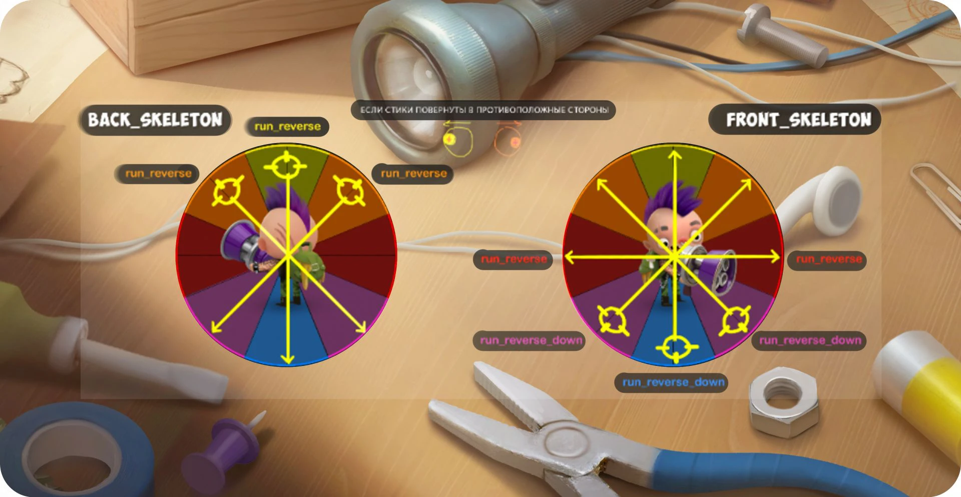Похожим образом описывается и анимация персонажа. Впрочем, тут много своих чувствительных моментов. Например то, как разные типы анимаций работают в комбинации. Опираясь на эти знания, тестировщикам проще проверить все возможные кейсы и убедиться в качестве продукта.