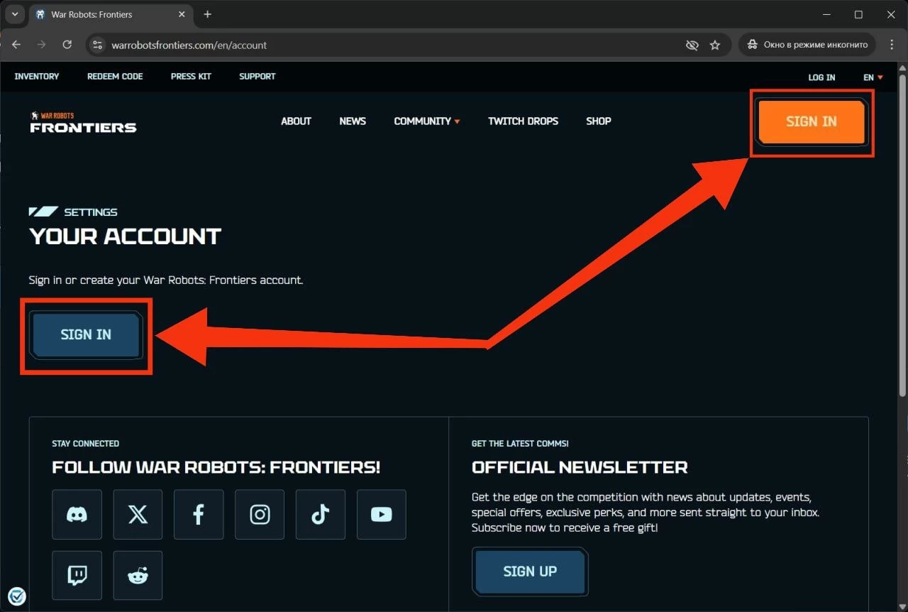 Переходим в личный кабинет на сайте игры по ссылке. Выполняем вход в ваш аккаунт через кнопку Sign in (Войти) через: