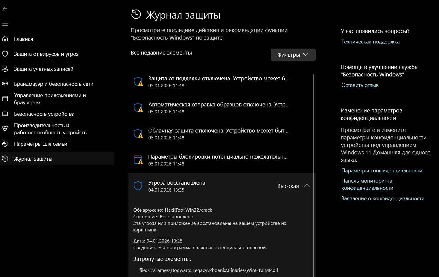 Если вы играете во взломанную версию Hogwarts Legacy, то могли столкнуться с ошибкой «Не обнаружен файл EMP.dll» во время запуска игры. Чтобы это исправить, откройте «Безопасность Windows» → «Журнал защиты» и найдите сообщение о том, что ваша ОС предотвратила угрозу, поместив файл EMP.dll в карантин. Уберите его из карантина и восстановите. После этого снова входите в Hogwarts Legacy и играйте.