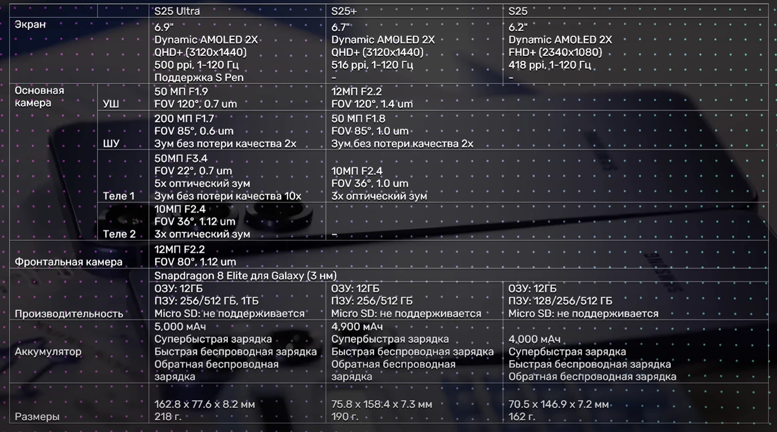 Как и ожидалось, Samsung показали только 3 модели Galaxy S25 — «ванильную», Plus и Ultra. В плане дизайна корпуса они сильно не поменялись по сравнению с прошлым поколением Galaxy S24, разве что Ultra стал более закруглённым. Все модели предлагают AMOLED-дисплей и чипсет Snapdragon 8 Elite без вариаций с Exynos для некоторых регионов. Также теперь у всех моделей минимальный размер оперативной памяти составляет 12 ГБ, а максимальный размер внутренней памяти — 512 ГБ, даже у обычного Galaxy S25. Ёмкость аккумулятора сильно не поменялась — 4000 мА*ч у S25, 4900 мА*ч у S25 Plus и 5000 мА*ч у S25 Ultra.