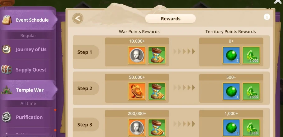 Награды за «Temple War» распределяются следующим образом: вы получаете отдельно награды за военные очки и территориальные очки.
