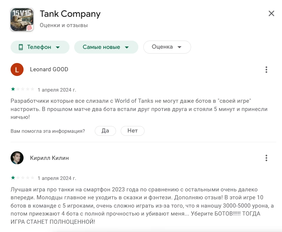 Но это меньшее из зол — по последним отзывам Tank Company в Play Market можно судить, что в игре много ботов, что после релиза Warzone Mobile с 120 реальными игроками в матче должно уйти в прошлое. Причём боты в Tank Company оказываются зачастую сильнее геймеров, танки которых под конец боя получили много урона. Помимо малого онлайна в этой танковой игре, её покинул русскоязычный комьюнити-менеджер. Из-за этого поддержка на Discord-сервере прекращается, а сами разработчики из Exptional Global покинут этот же сервер. После этого они будут поддерживать игроков только в самой Tank Company и по электронной почте.