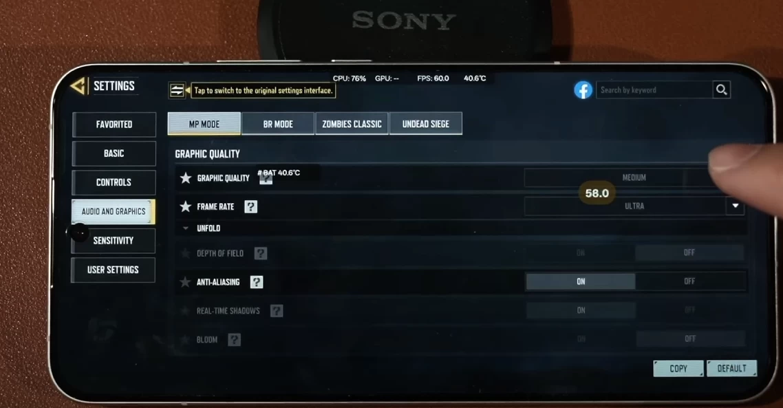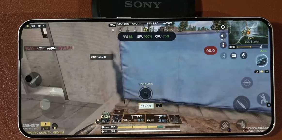 Казалось, что Call of Duty Mobile можно будет запустить на самых максимальных настройках, но нет — ультра FPS и средний пресет графики. Смартфон выдаёт 89-90 FPS на открытой местности в режиме «королевская битва».