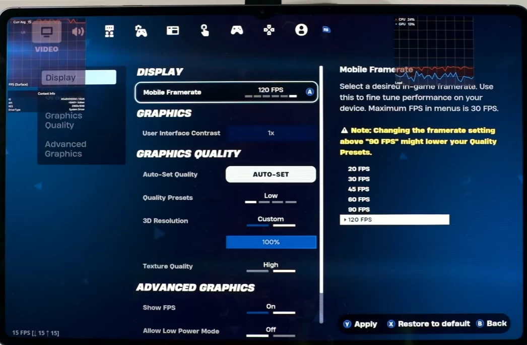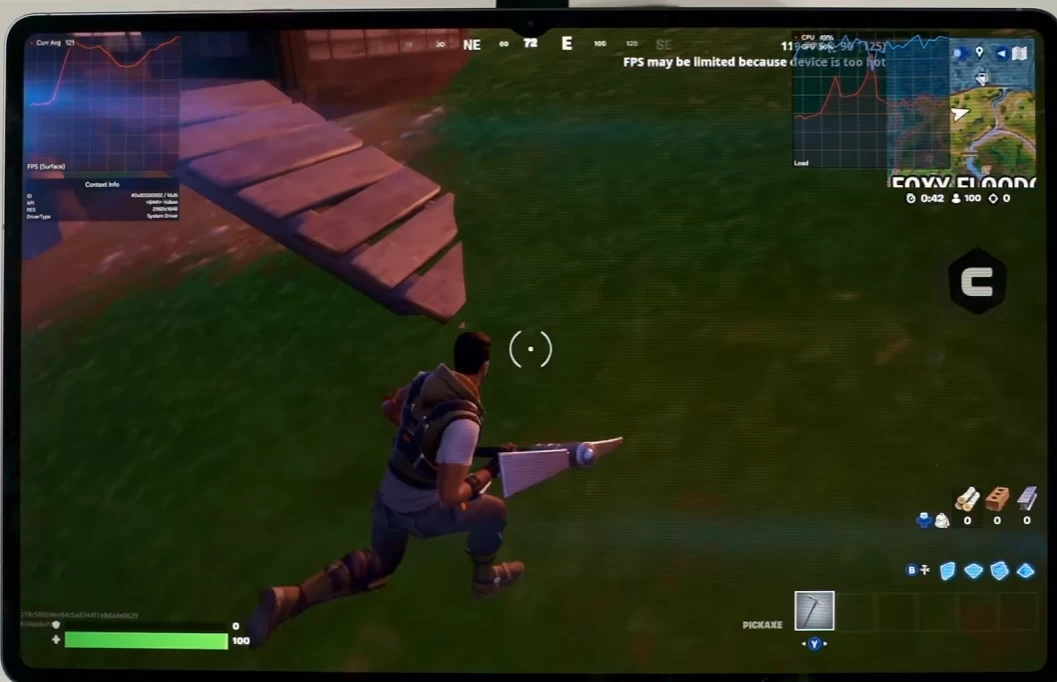 Под конец проверим Fortnite. Если хотите играть в 120 FPS, качество картинки автоматически выставляется на «Низкое». В целом, планшет способен выдавать 120 кадров, но к этому моменту он сильно нагрелся, так что дадим малышу отдохнуть и остыть.