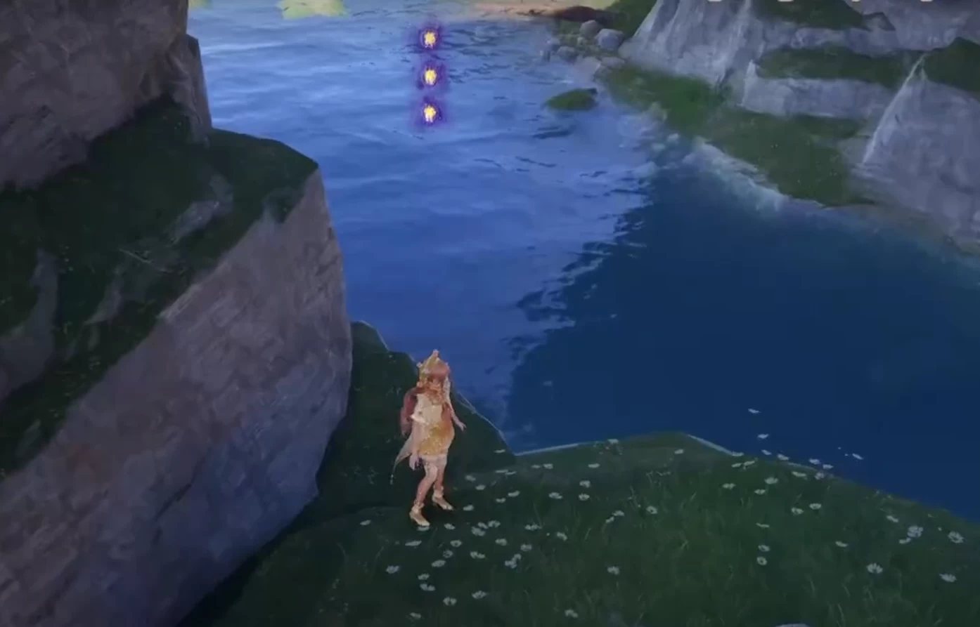 После этого поворачиваем направо и бежим по дороге рядом со скалой, потом рядом с синим растением спрыгиваем вниз и наблюдаем 3 Dew над водой.