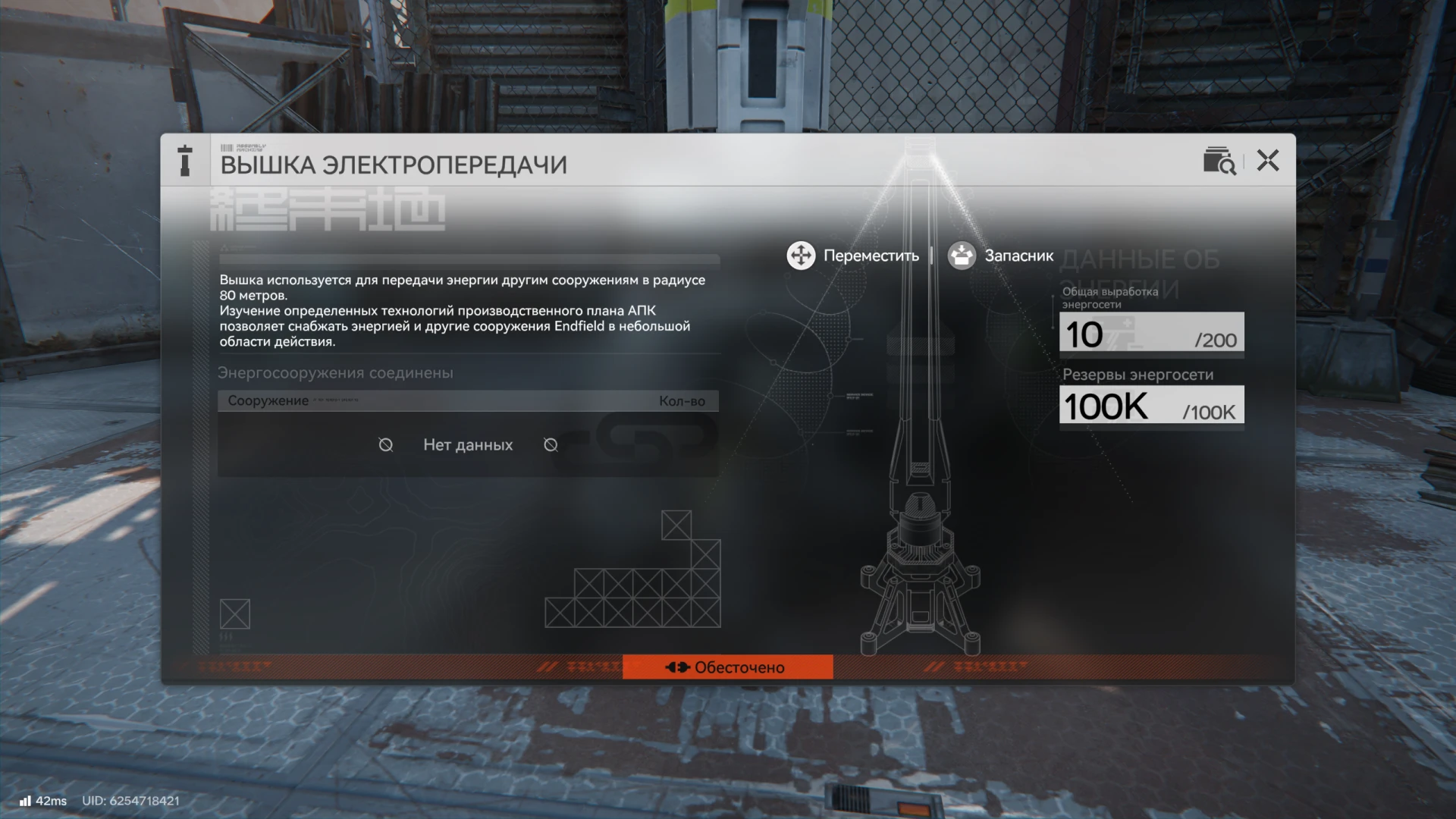 На стартовой базе игроки Arknights Endfield могут нажать клавишу Z, чтобы открыть меню со списком сооружений. Чтобы запитать энергией отдалённые объекты, нам понадобится «Вышка ЭП». После стартовых миссий у вас будет несколько штук, но если все потратили, обязательно постройте их — они пригодятся.